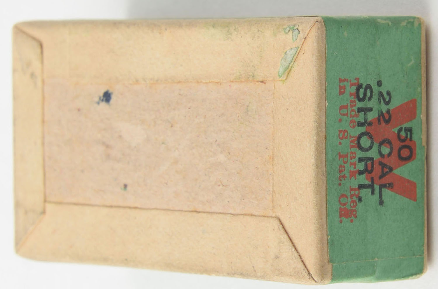 Winchester, Rifle Cartridges, .22 Short, Not in RR, Similar to RR: WRA-41 S-18a (but no codes on top), FULL & SEALED, 2pc. Buff box with green top & side sealing labels, box is solid with excellent color, very minor edge & corner wear, labels are intact. Grade: Excellent + - Value: 60 to 90