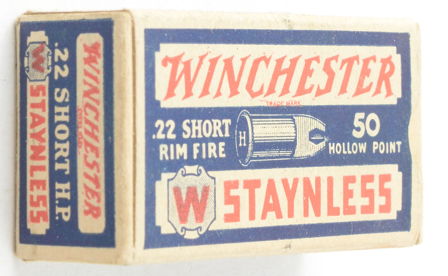 Winchester, Staynless, .22 Short Hollow Point, RHWeb: WRA-12A S-2, Full, 1pc. Blue white & red box, box is solid with excellent color, very minor corner wear, edges are mostly crisp, end flaps are solid, ammo is good to very good. Grade: Excellent + - Value: 200 to 300