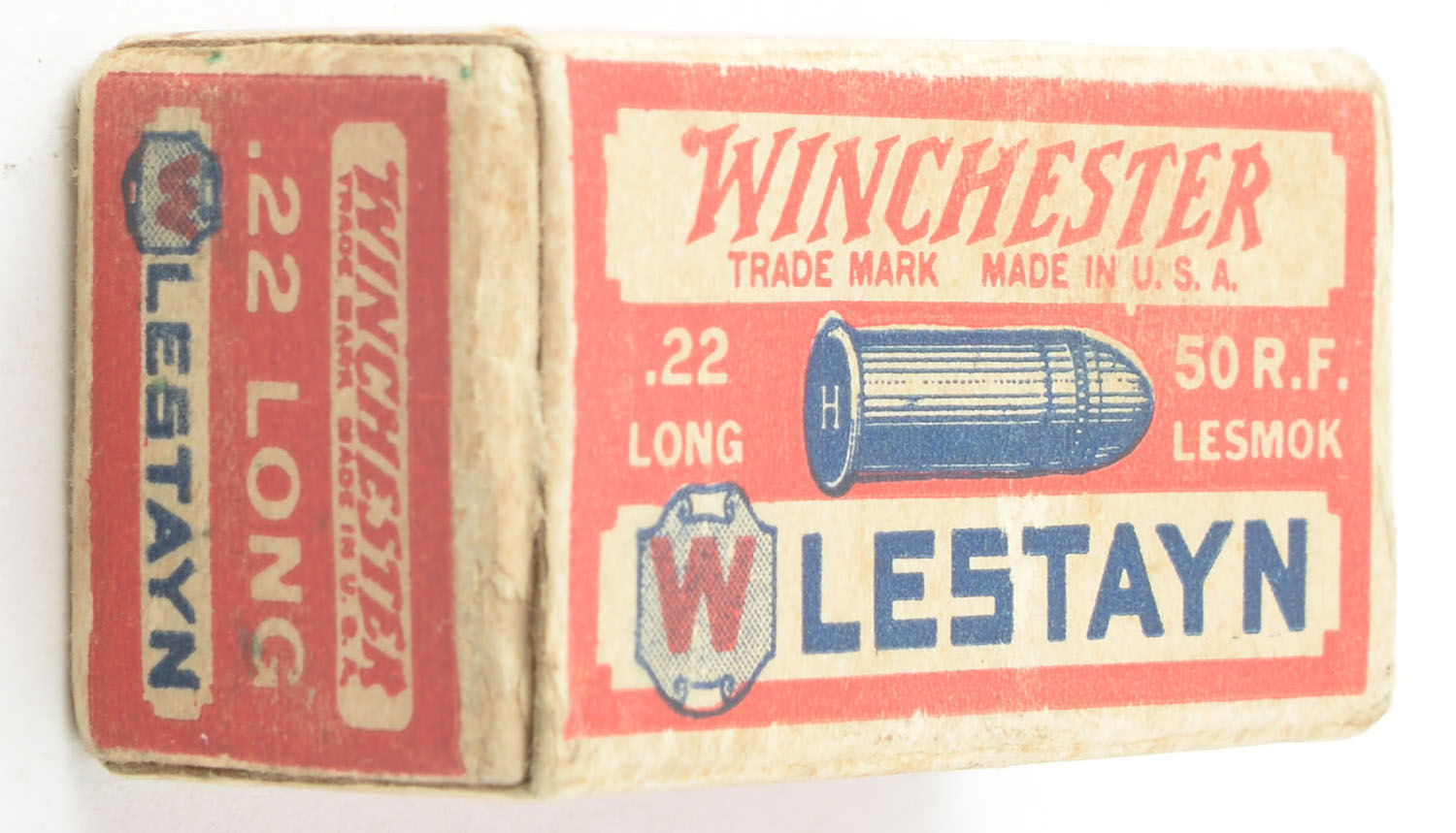 Winchester, Lestayn, .22 Long, RHWeb: WRA-13.5 L-1a, Full, 1pc. Red white & blue box, box is solid with very good color, some age soiling, some edge & corner wear, end flaps are solid, ammo is fair. Grade: Very Good + - Value: 150 to 225