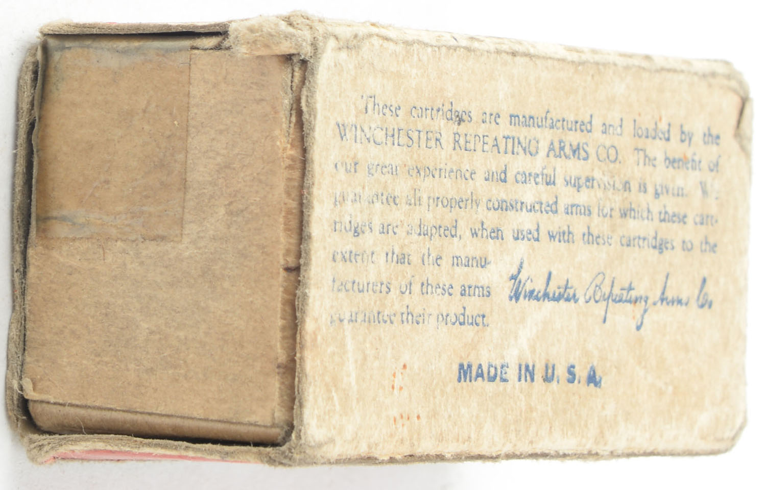 Winchester, Lestayn, .22 W.R.F., RHWeb: WRA-13.5 WRF-1, Partial 45rds., 1pc. Red white & blue box, missing both end flaps, seam split to top back edge that has been taped, good to very good color, age soiling, edge and corner wear, ammo is very good. Grade: Fair - Value: 24 to 36