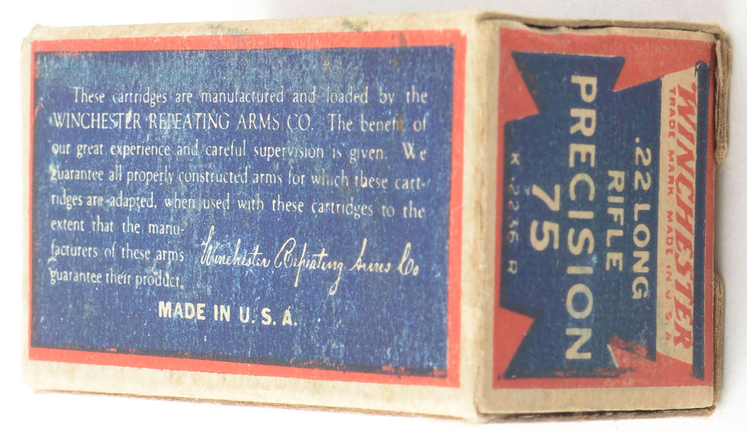 Winchester, Precision 75, .22 Long Rifle, RHWeb: WRA-53 LR-10, Full, 1pc. Blue red & white box, box is solid with very good to excellent color, minor age soiling & corner wear, edges are crisp, end flaps are solid, ammo is very good. Grade: Excellent - Value: 1000 to 1500