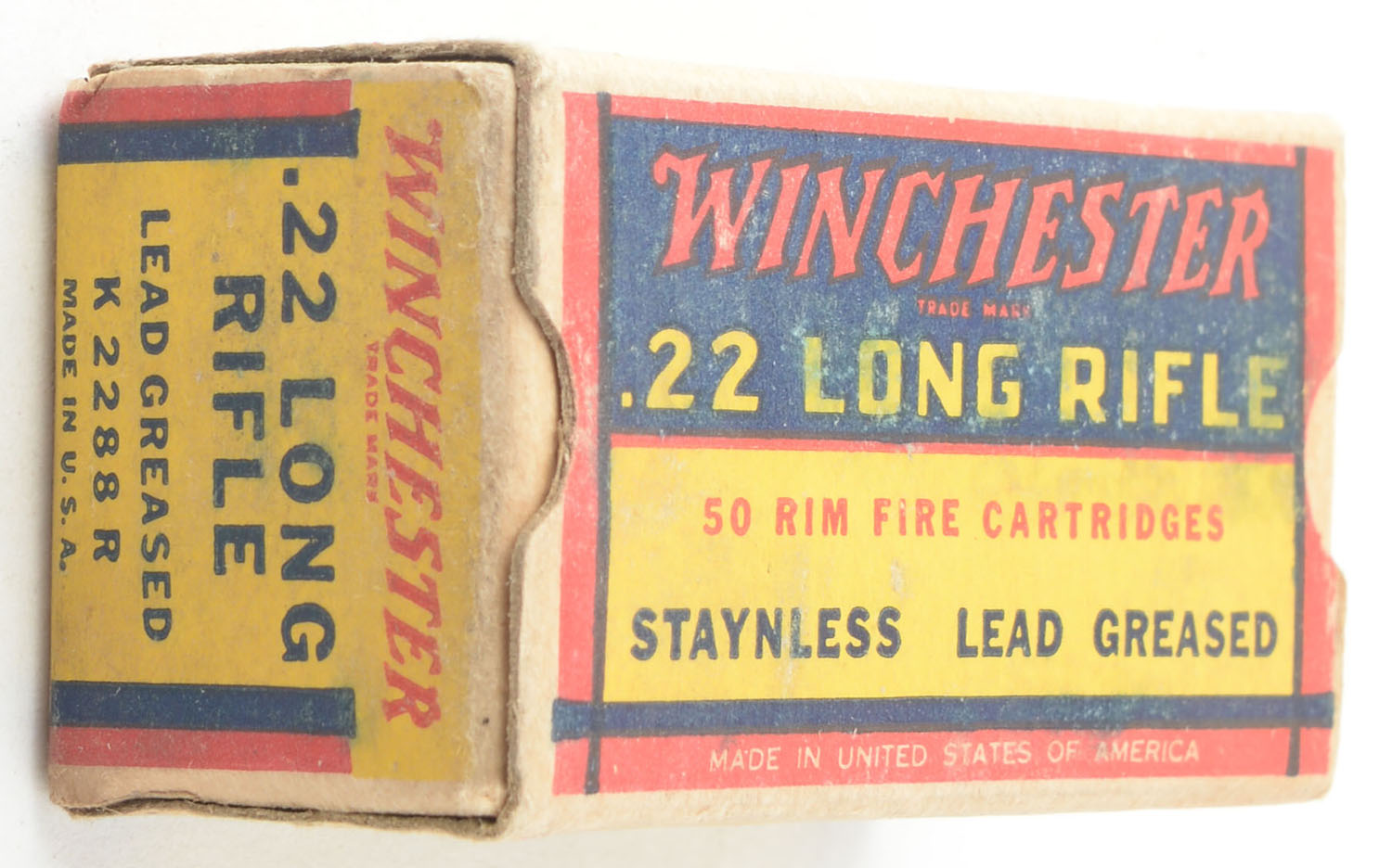 Winchester, Staynless, .22 Long Rifle, Army Lot T 210, Full, 1pc. Yellow blue & red box, box is solid with very good color, minor age soiling, shelf wear, staining on bottom front & back sides, very minor corner wear, edges are mostly crisp, end flaps are solid, ammo is excellent. Grade: Very Good - Value: 10 to 15