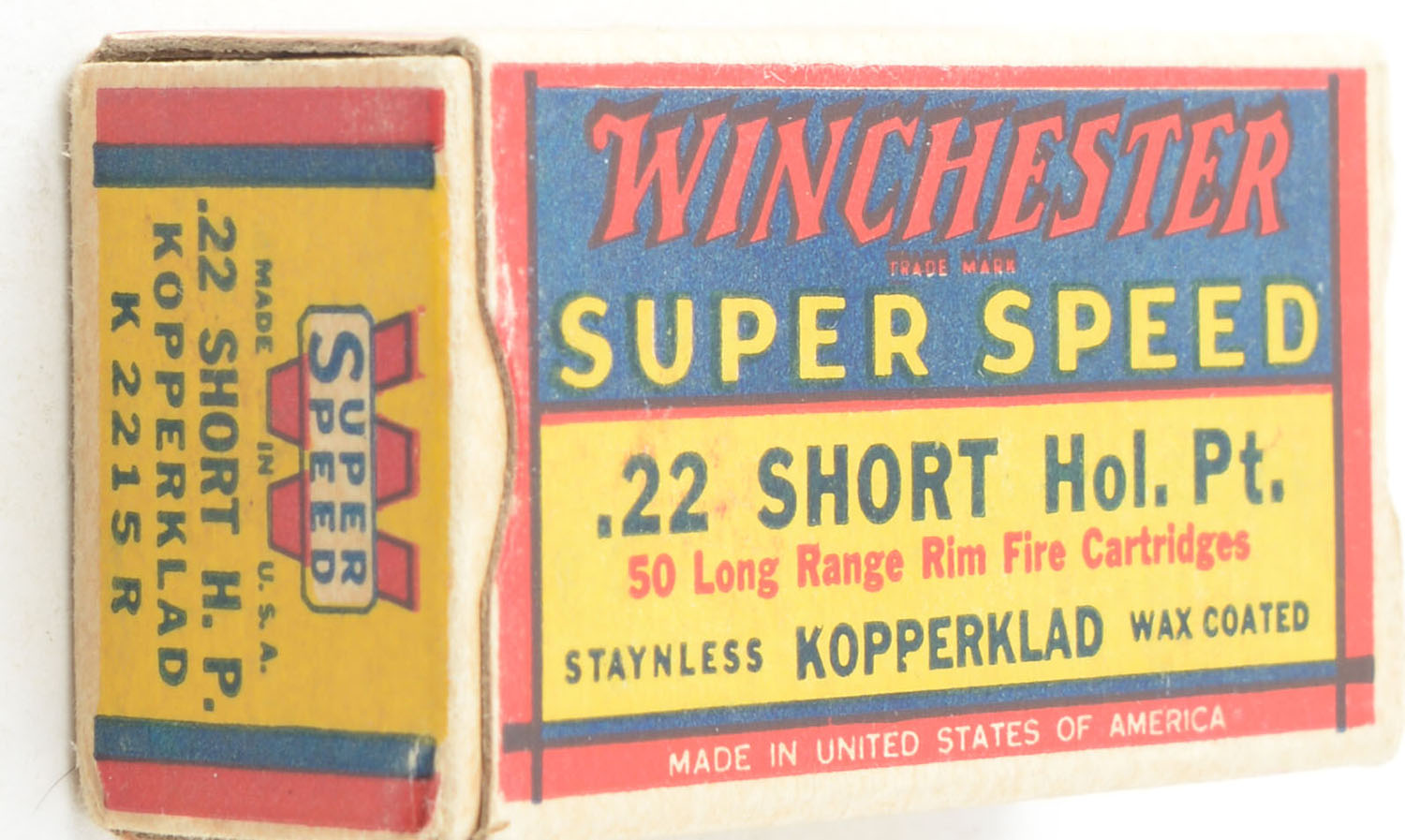 Winchester, Super Speed, .22 Short Hollow Point, RHWeb: WRA-15 S-2b, Full, 1pc. Yellow blue & red box, box is solid with excellent color, minor corner wear, edges are mostly crisp, end flaps are solid, ammo is excellent to minty. Grade: Excellent + - Value: 40 to 60