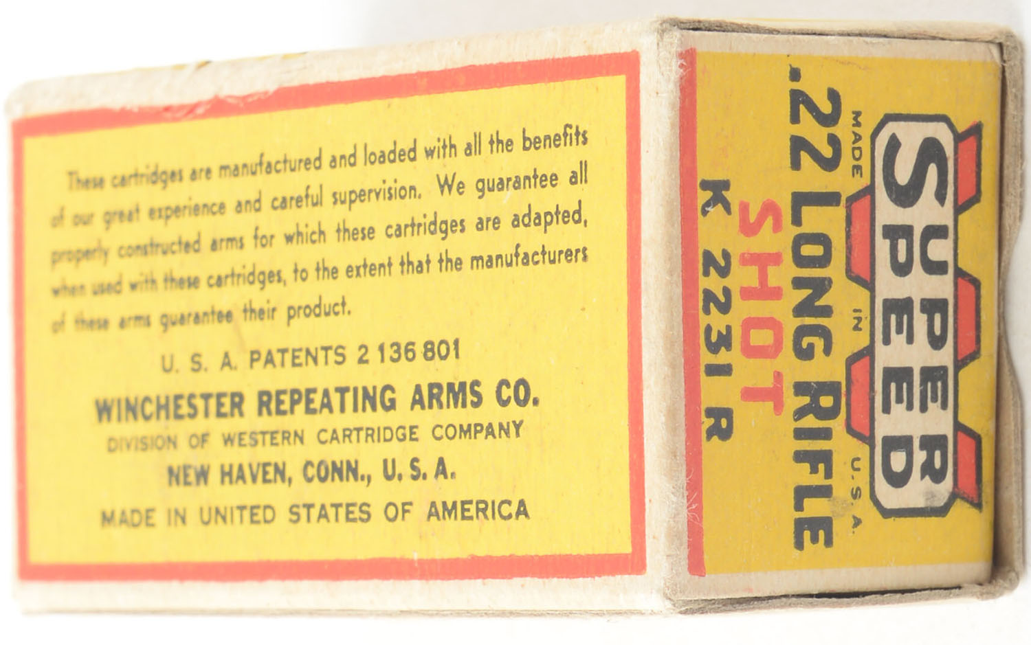 Winchester, Super Speed, .22 Long Rifle Shot, Staynless, RHWeb: WRA-15 LR-4, Full, 1pc. Yellow red & black box, box is solid with excellent color, very minor edge wear, corners are mostly sharp, edges are crisp, end flaps are solid, ammo is excellent. Grade: Excellent + - Value: 80 to 120