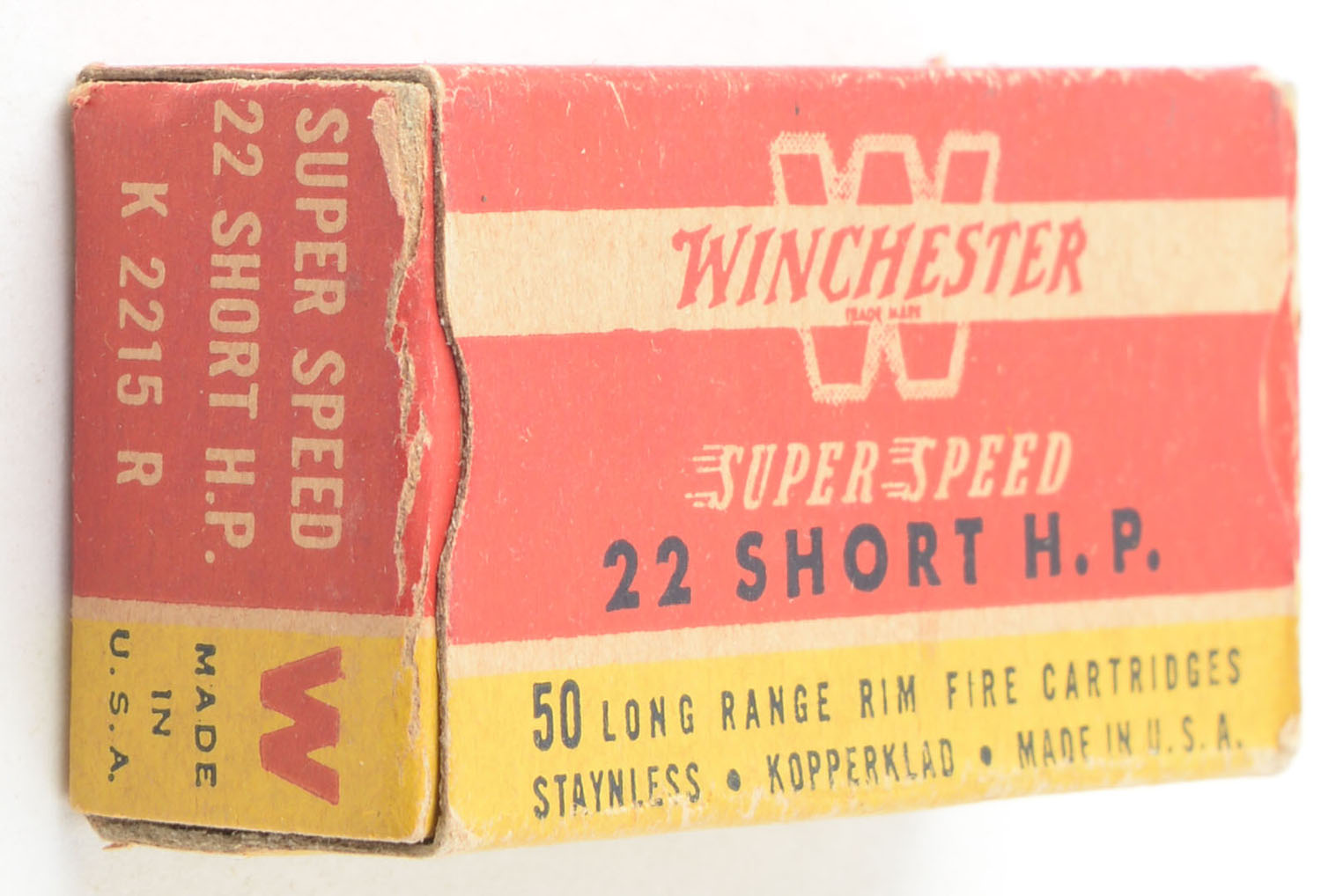 Winchester, Super Speed, .22 Short Hollow Point, RHWeb: WRA-17 S-3a, Full, 1pc. Red yellow & white box, box is solid with very good color, some age soiling, minor edge & corner wear, end flaps are solid, ammo is excellent. Grade: Very Good ++ - Value: 12 to 18