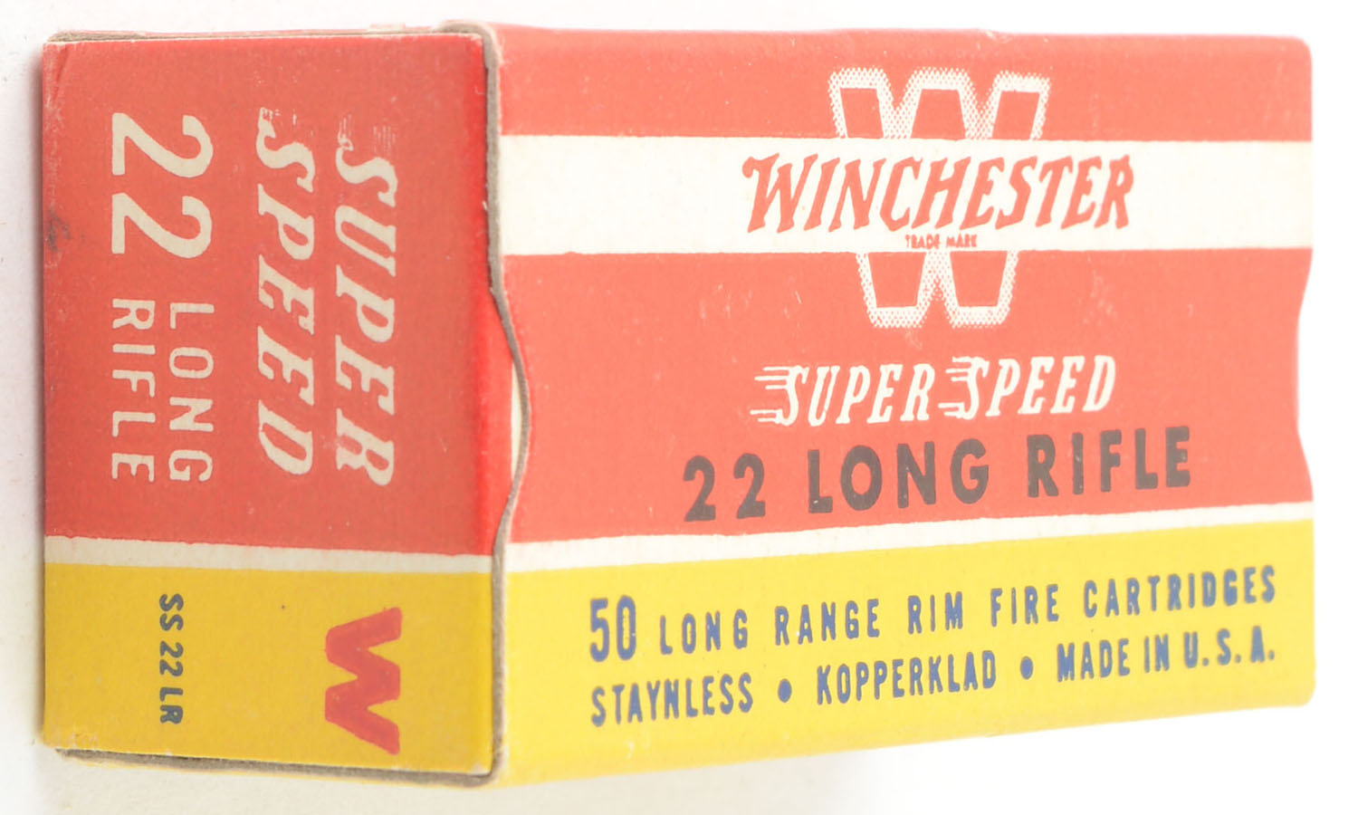 Winchester, Super Speed, .22 Long Rifle, RHWeb: WRA-17 LR-1d, Full, 1pc. Red yellow & white box, box is near mint with minty color, only very minor corner wear, edges are crisp, end flaps are solid, ammo is minty. Grade: Excellent ++ - Value: 10 to 15