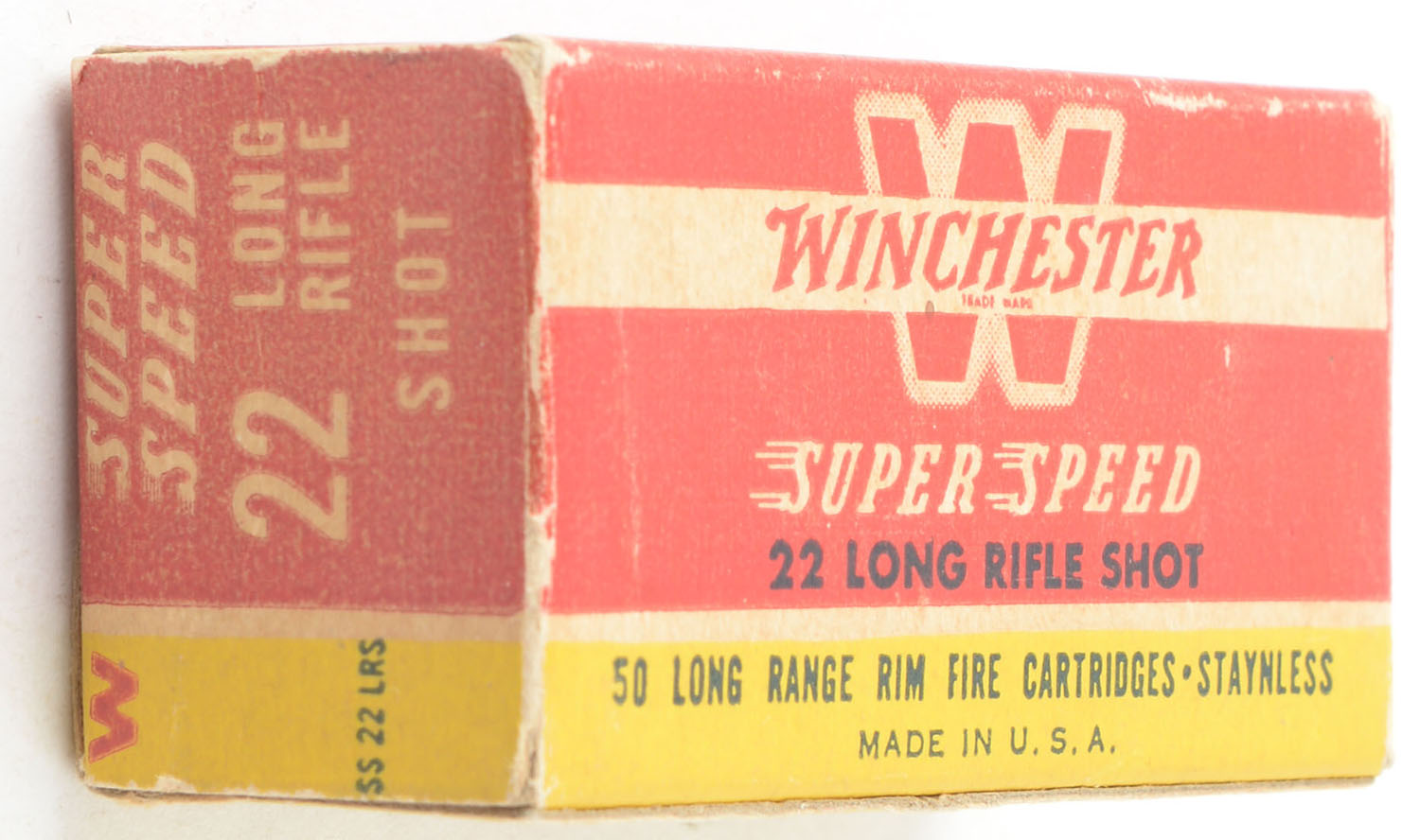 Winchester, Super Speed, .22 Long Rifle Shot, RHWeb: WRA-17 LR-5d, Partial 41rds., 1pc. Red yellow & white box, box is solid with excellent color, very minor age soiling, minor edge & corner wear, end flaps are solid, ammo is excellent. Grade: Very Good ++ - Value: 10 to 15