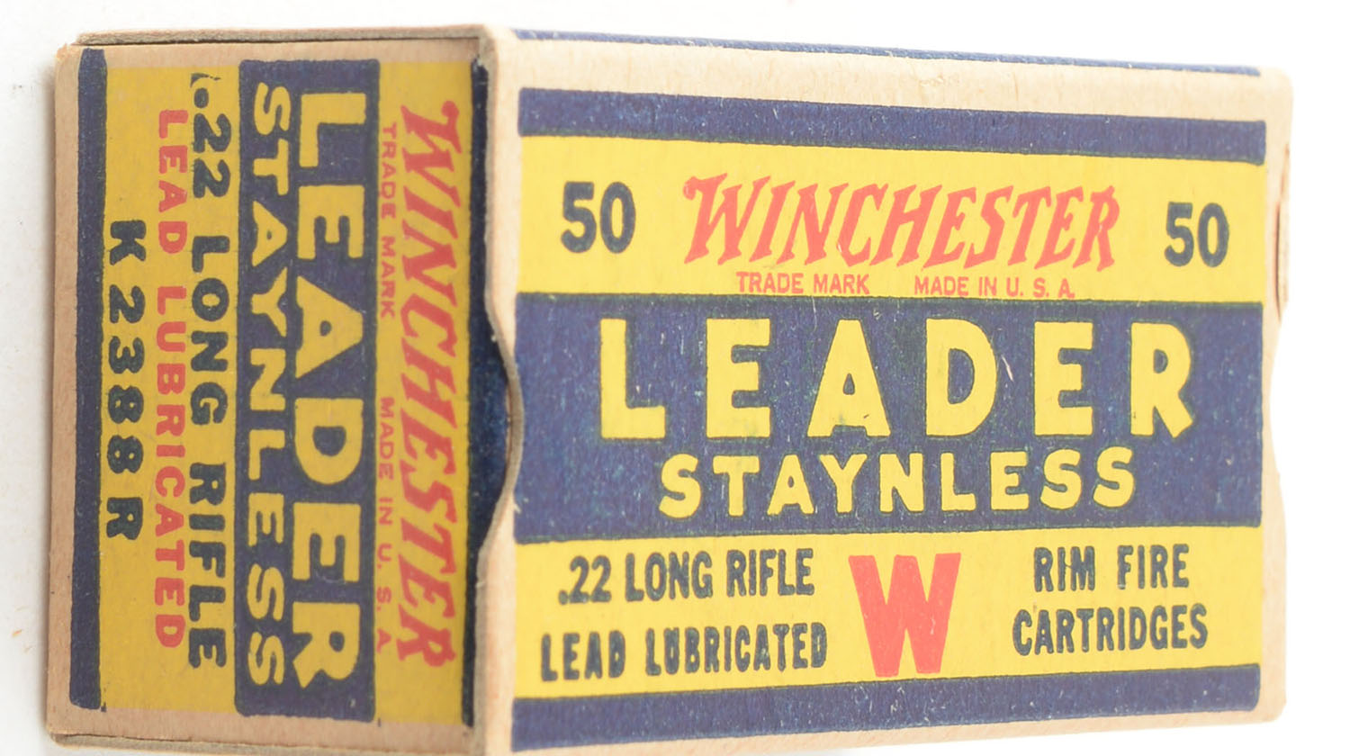 Winchester, Leader Staynless, .22 Long Rifle, RHWeb: WRA-55 LR-1c, Full, 1pc. Yellow blue & red box, box is solid with excellent color, very minor age soiling & corner wear, edges are mostly crisp, end flaps are solid, ammo is very good. Grade: Excellent - Value: 24 to 36