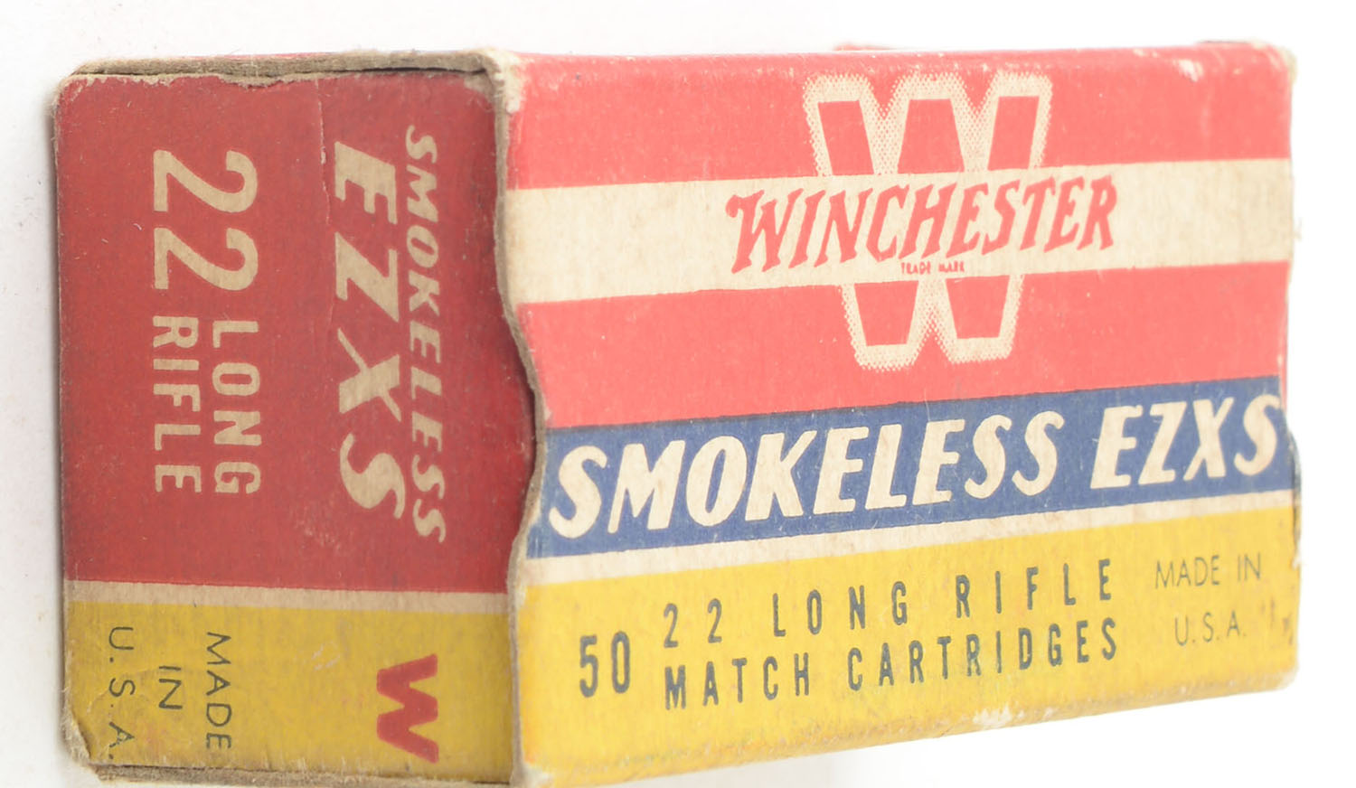 Winchester, Smokeless EZXS, .22 Long Rifle, Match Cartridges, RHWeb: WRA-54 LR-7, Full, 1pc. Red yellow & blue box, box is solid with very good color, minor age soiling, very minor edge & corner wear, end flaps are solid, ammo is very good. Grade: Very Good ++ - Value: 12 to 18