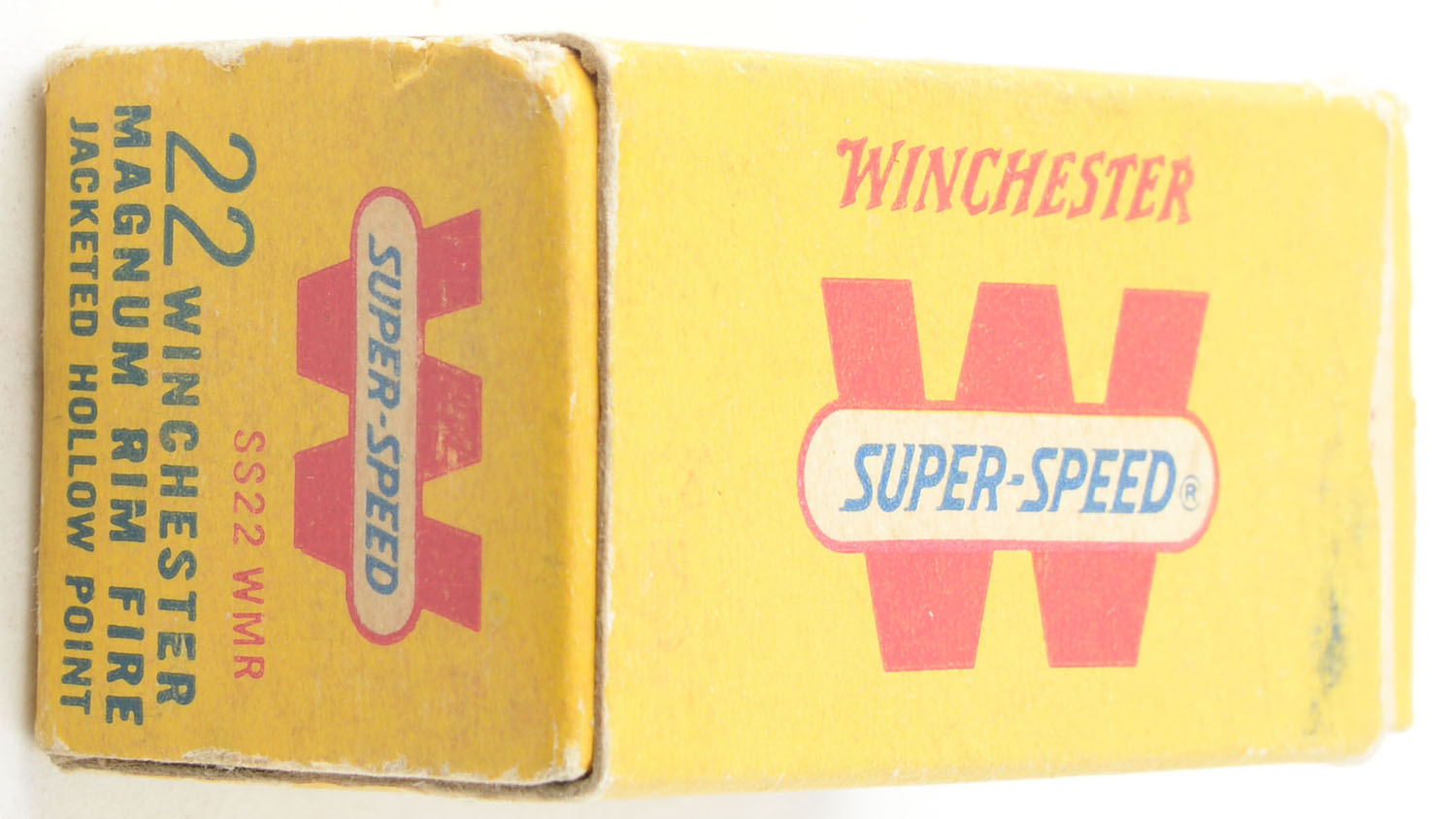Winchester, Super-Speed, .22 Winchester Magnum, 40 Grain Jacketed Hollow Point, RHWeb: WRA-19 WMR-1.5, Partial 38rds., 1pc. Yellow white & red box, right end flap is torn, very good color, minor age soiling, stain on top, minor corner wear, edges are mostly crisp, left end flap is solid, ammo is good to very good. Grade: Good - Value: 8 to 12