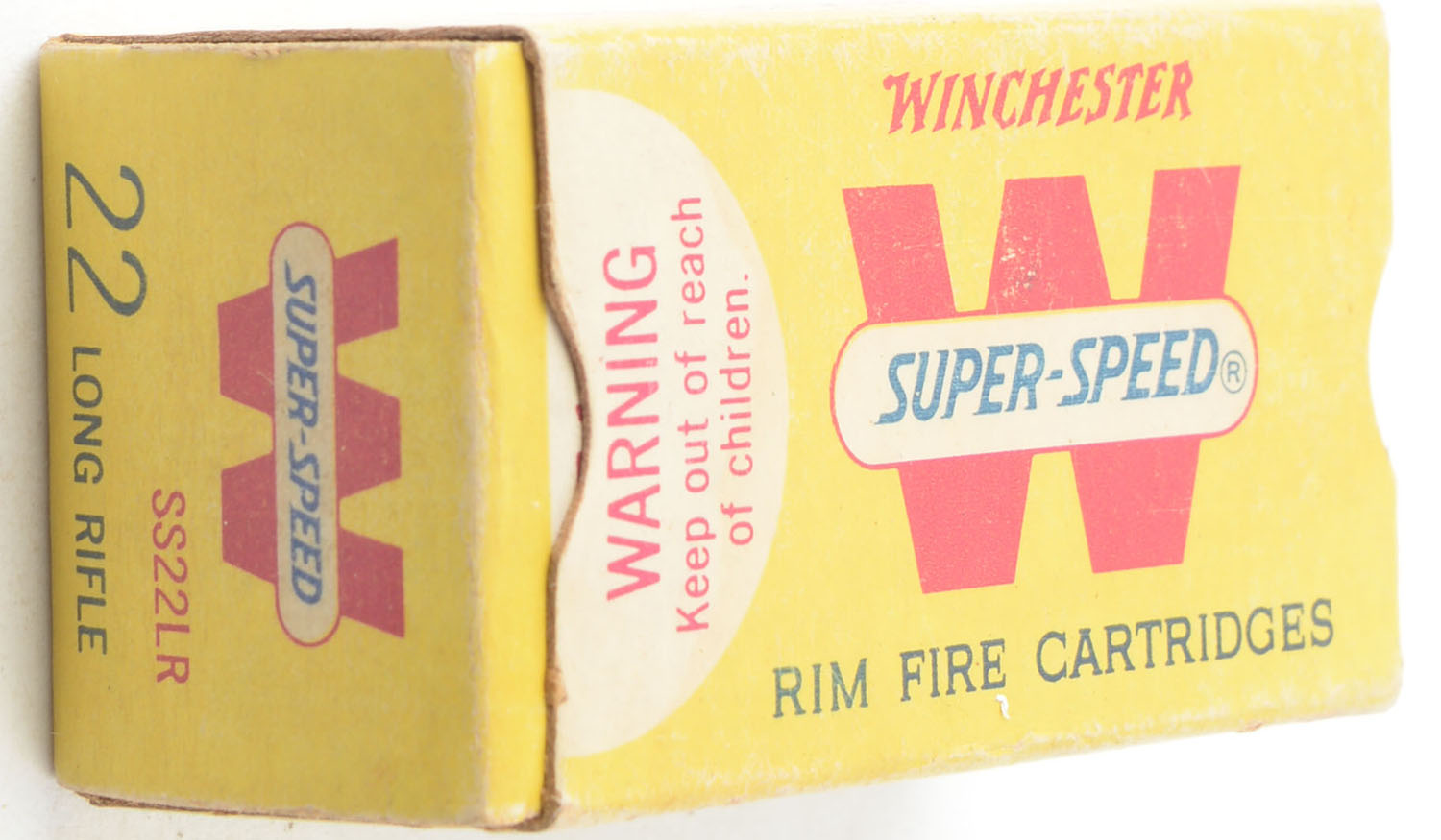 Winchester, Super-Speed, .22 Long Rifle, 40 Gr. Kopperklad Bullet, RHWeb: WRA-20 LR-1, Full, 1pc. Yellow white & red box, box is solid with very good color, minor age soiling, very minor corner wear, edges are crisp, end flaps are solid, ammo is excellent to minty. Grade: Very Good ++ - Value: 6 to 10