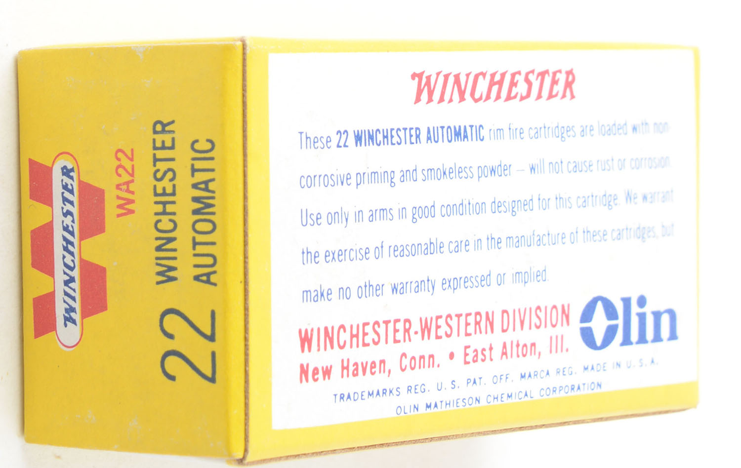 Winchester, W, .22 Winchester Automatic, 45 Gr. Kopperklad Bullet, RHWeb: WRA-20 WA-1, Full, 1pc. Yellow white & red box, box is MINT with minty color, corners are sharp, edges are crisp, end flaps are solid, ammo is minty. Grade: MINT - Value: 30 to 45