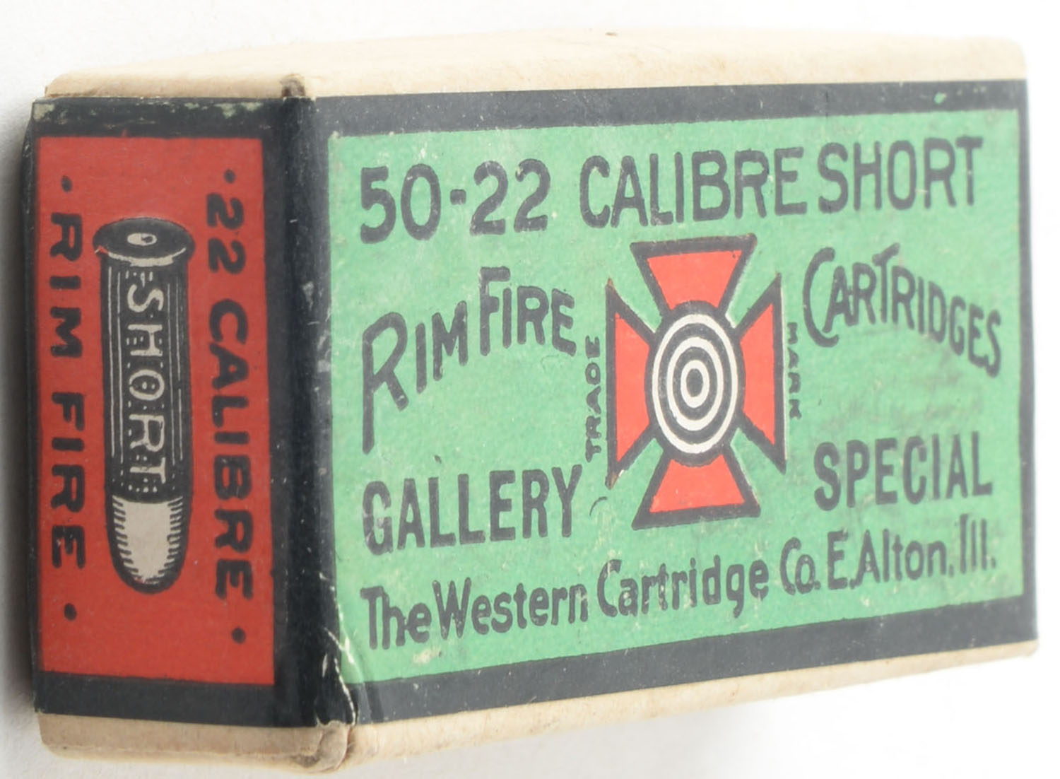 RARE! Western, Gallery Special, .22 Short, RHWeb: WCC-48 S-1, FULL & SEALED, 2pc. Buff box with green red & black wraparound label, box is solid with excellent color, very minor shelf & corner wear, edges are crisp, label is intact. Grade: Excellent ++ - Value: 400 to 600