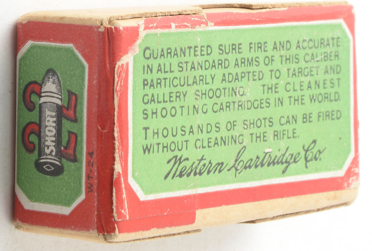 Western, .22 Short, Lesmok Powder, RHWeb: WCC-3 S-2b, FULL & SEALED, 2pc. Buff box with green & red wraparound label, box is solid with excellent color, very minor shelf wear, edges are crisp, corners are mostly sharp, label is intact. Grade: Excellent + - Value: 100 to 150