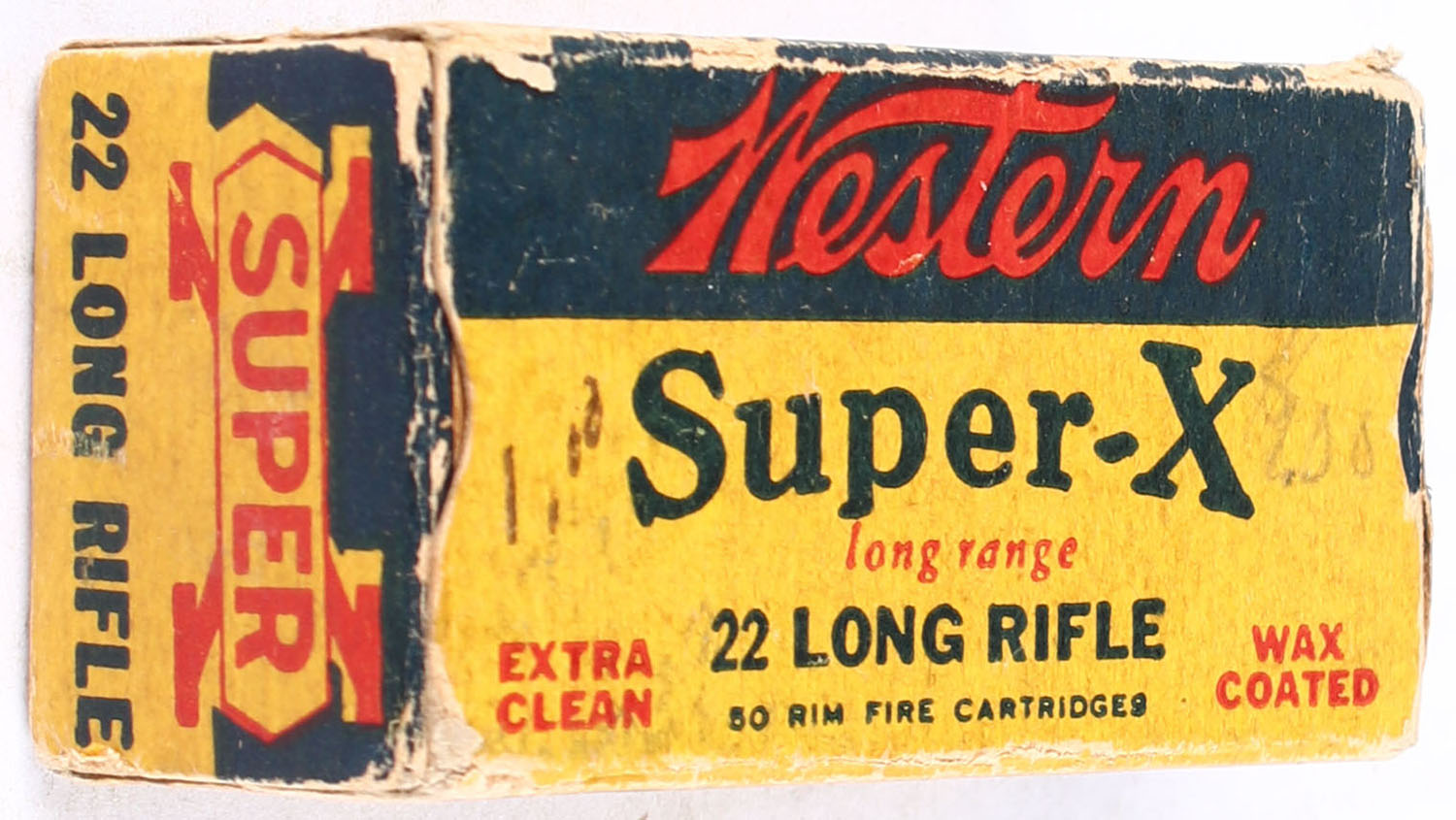 Western, Super-X, .22 Long Rifle, Extra Clean Wax Coated, RHWeb: Super-X-Long Rifle-15 LR-35, Full, 1pc. Yellow blue & red box, box is solid with very good color, some age soiling & corner wear, minor edge wear, end flaps are solid, top has been written on, ammo is very good. Grade: Very Good - Value: 6 to 10
