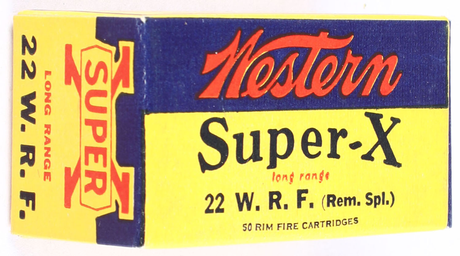 Western, Super-X, .22 W.R.F., Long Range, RHWeb: Super-X-W.R.F-9 WRF-13, Full, 1pc. Yellow blue & red box, box is MINT with minty color, corners are sharp, edges are crisp, end flaps are solid ammo is very good to excellent. Grade: MINT - Value: 30 to 45