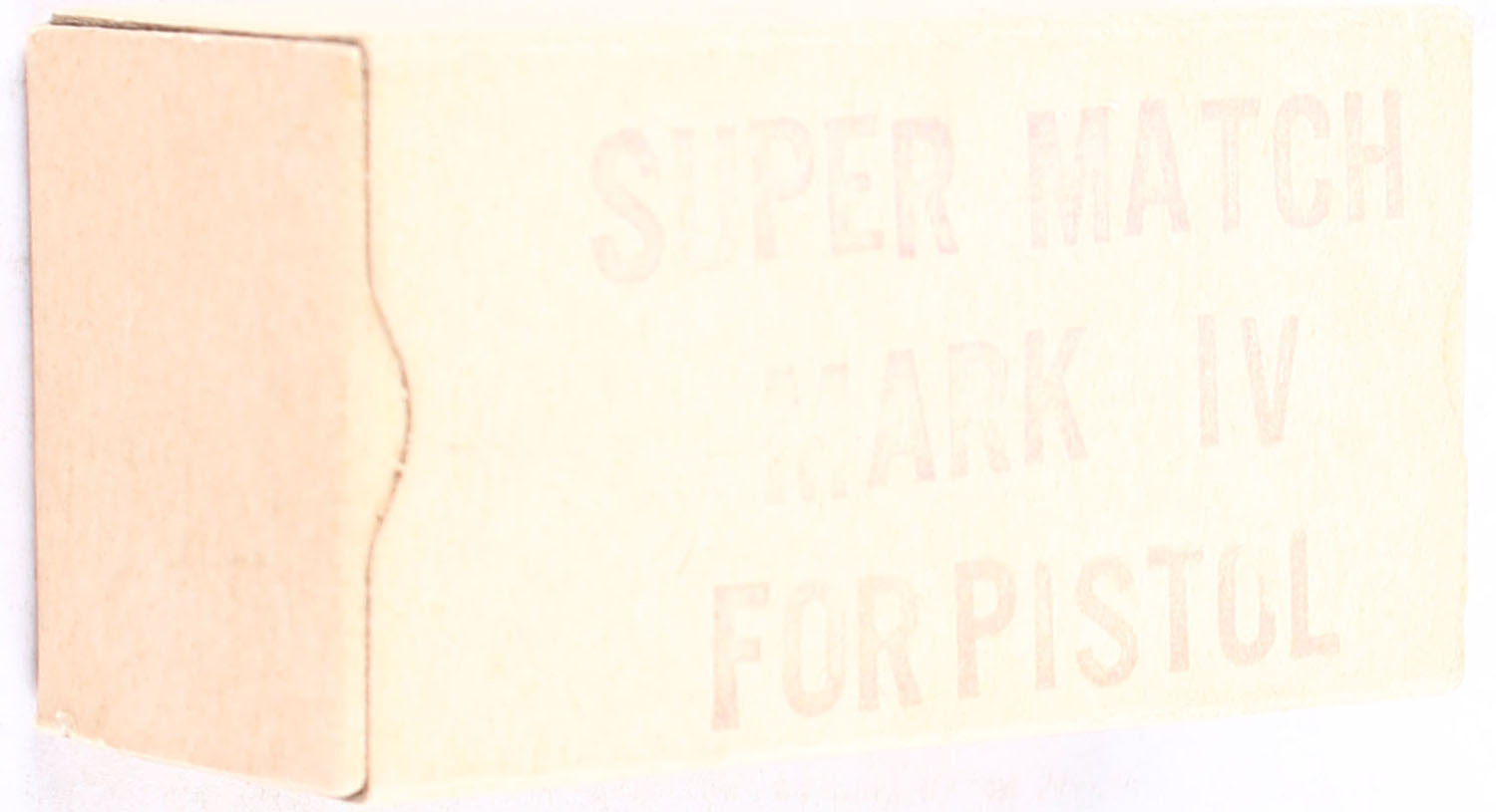 Western, Super Match Mark IV, .22 Long Rifle, For Pistol, RHWeb: WCC-51.6 LR-4, Full, 1pc. Buff box with black printing, box is solid with excellent color, very minor age soiling, corners are mostly sharp, edges are mostly crisp, end flaps are solid, ammo is minty. Grade: Excellent + - Value: 30 to 45