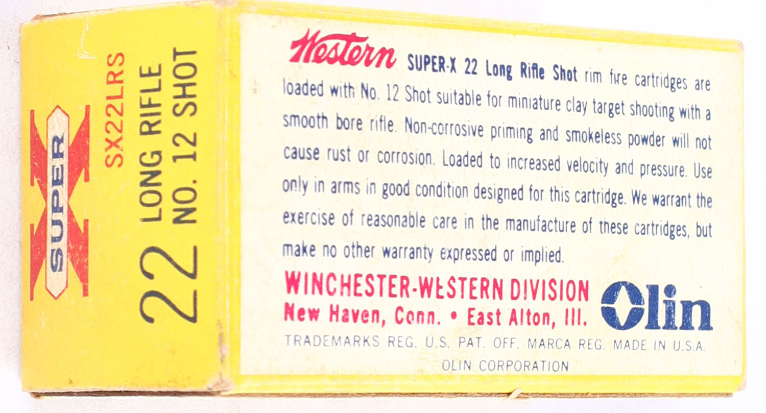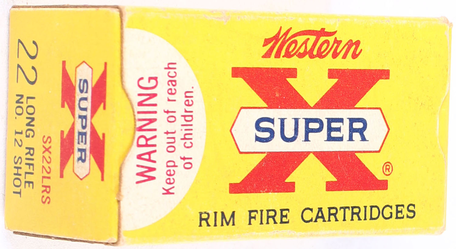 Western, Super X, .22 Long Rifle Shot, RHWeb: WCC-12 LR-5c, Full, 1pc. Yellow white & red box, box is solid with excellent color, very minor age soiling & shelf wear, edges are mostly crisp, end flaps are solid, ammo is excellent. Grade: Excellent - Value: 12 to 18