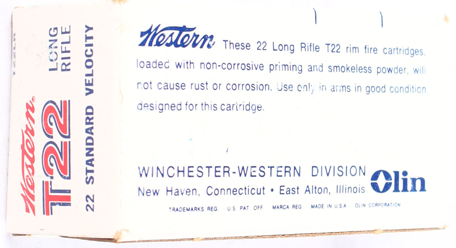 Western, T22, .22 Long Rifle, Standard Velocity, RHWeb: WCC-53A, Full, 1pc. White red & black box, box is solid with excellent color, very minor shelf wear, very minor edge & corner wear, end flaps are solid, ammo is excellent to minty. Grade: Excellent - Value: 10 to 15