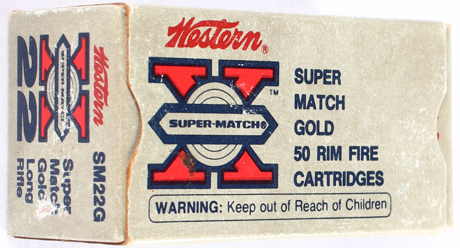 Western, Super Match Gold, .22 Long Rifle, Special Match Bullet, RHWeb: WCC-51.5 LR-2, Full, 1pc. Gold red & black box, box is solid with very good color, minor color fading, some shelf wear, very minor edge & corner wear, end flaps are solid, ammo is excellent. Grade: Very Good - Value: 40 to 60