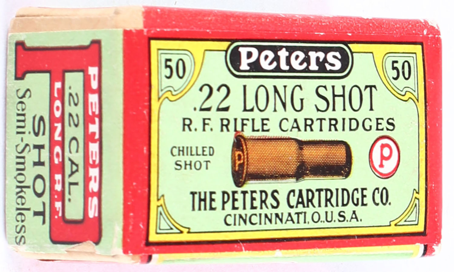 Peters, R.F. Rifle Cartridges, .22 Long Shot, Semi-Smokeless, RHWeb: PCC-5A L-5a, FULL & SEALED, 2pc. Buff box with green red & yellow full wraparound label, box is solid with minty color, very minor shelf & corner wear, edges are crisp, label is intact. Grade: Excellent + - Value: 300 to 450