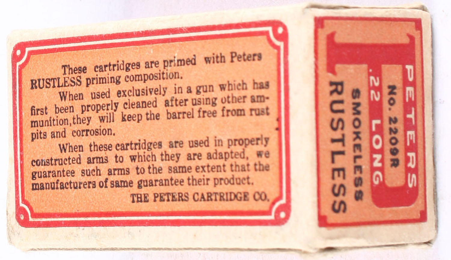 Peters, Rustless, .22 Long Rifle, Smokeless Powder, RHWeb: PCC-7 L-3, Partial 48rds. 1pc. Orange red & buff box, box is solid with excellent color, very minor age soiling, very small stain on top, minor corner wear, edges are mostly crisp, end flaps are solid, ammo is very good to excellent. Grade: Excellent - Value: 100 to 150