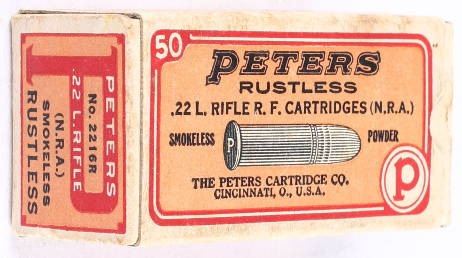 Peters, Rustless (N.R.A), .22 Long Rifle, Smokeless Powder, RHWeb: PCC-51 LR-7, Full, 1pc. Salmon red & buff box, box is solid with excellent color, minor age soiling & corner wear, very minor edge wear, end flaps are solid, ammo is very good to excellent. Grade: Excellent - Value: 100 to 150