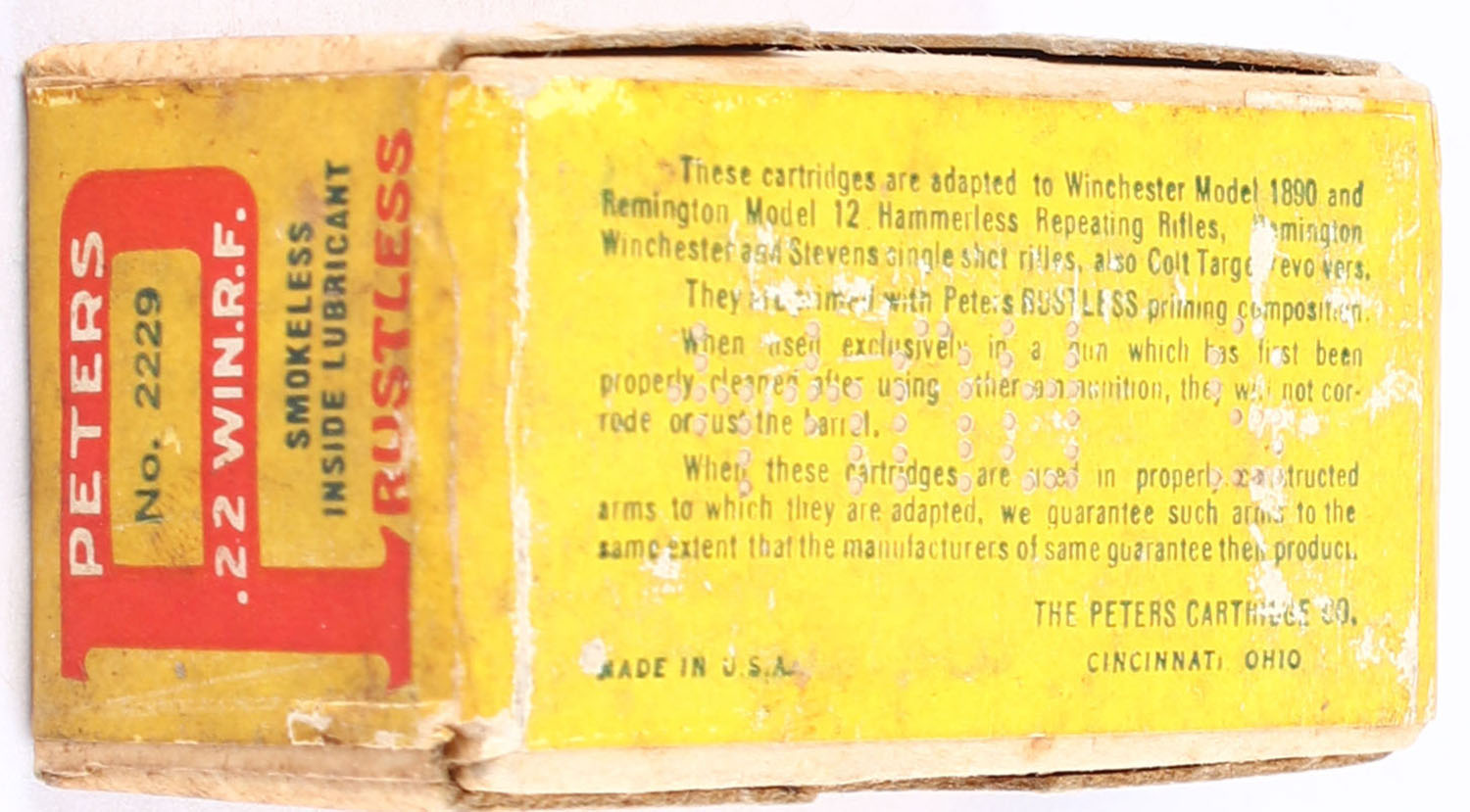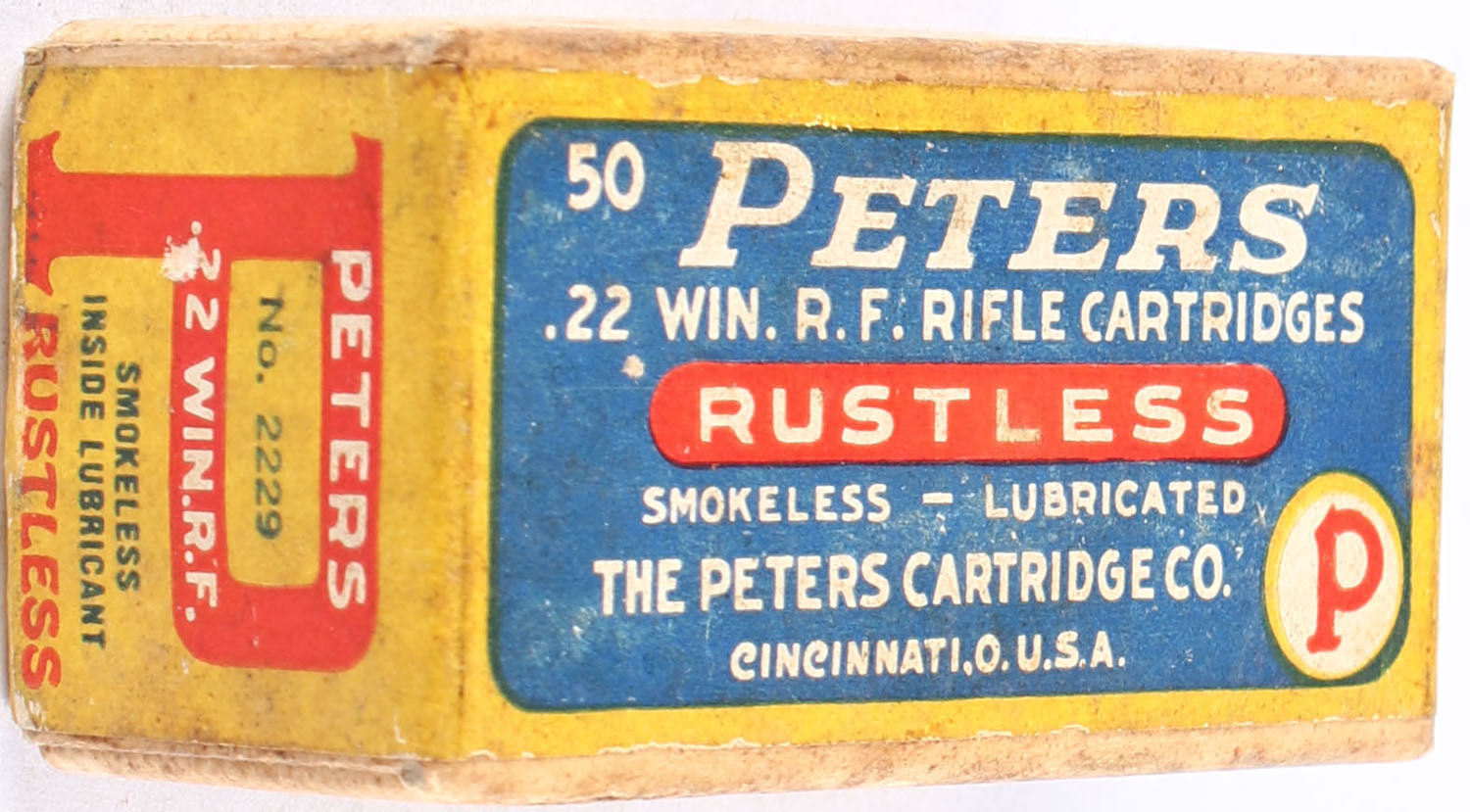 Peters, Rustless, .22 Winchester Rim Fire, Inside Lubricated, RHWeb: PCC-8 WRF-4, FULL & SEALED, 2pc. Buff box with blue yellow & red wraparound label, box is solid with very good color, minor age soiling, some staining on front & back sides, minor edge & corner wear, label is intact. Grade: Very Good + - Value: 50 to 75