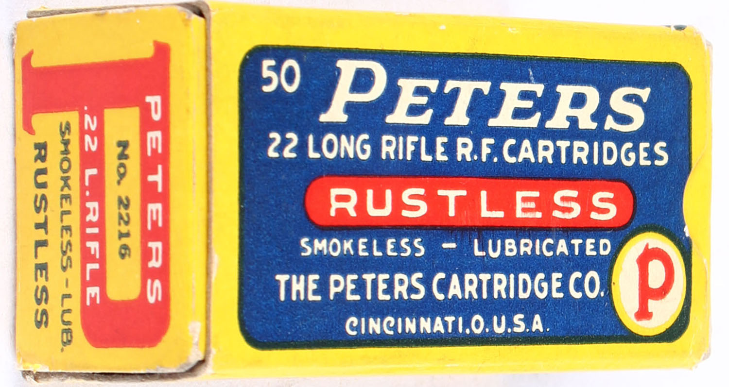 Peters, Rustless, .22 Long Rifle, Lubricated, RHWeb: PCC-8A LR-1a, Full, 1pc. Blue yellow & red box, box is near mint with minty color, only very minor corner wear, edges are mostly crisp, end flaps are solid, ammo is excellent. Grade: Excellent ++ - Value: 60 to 90
