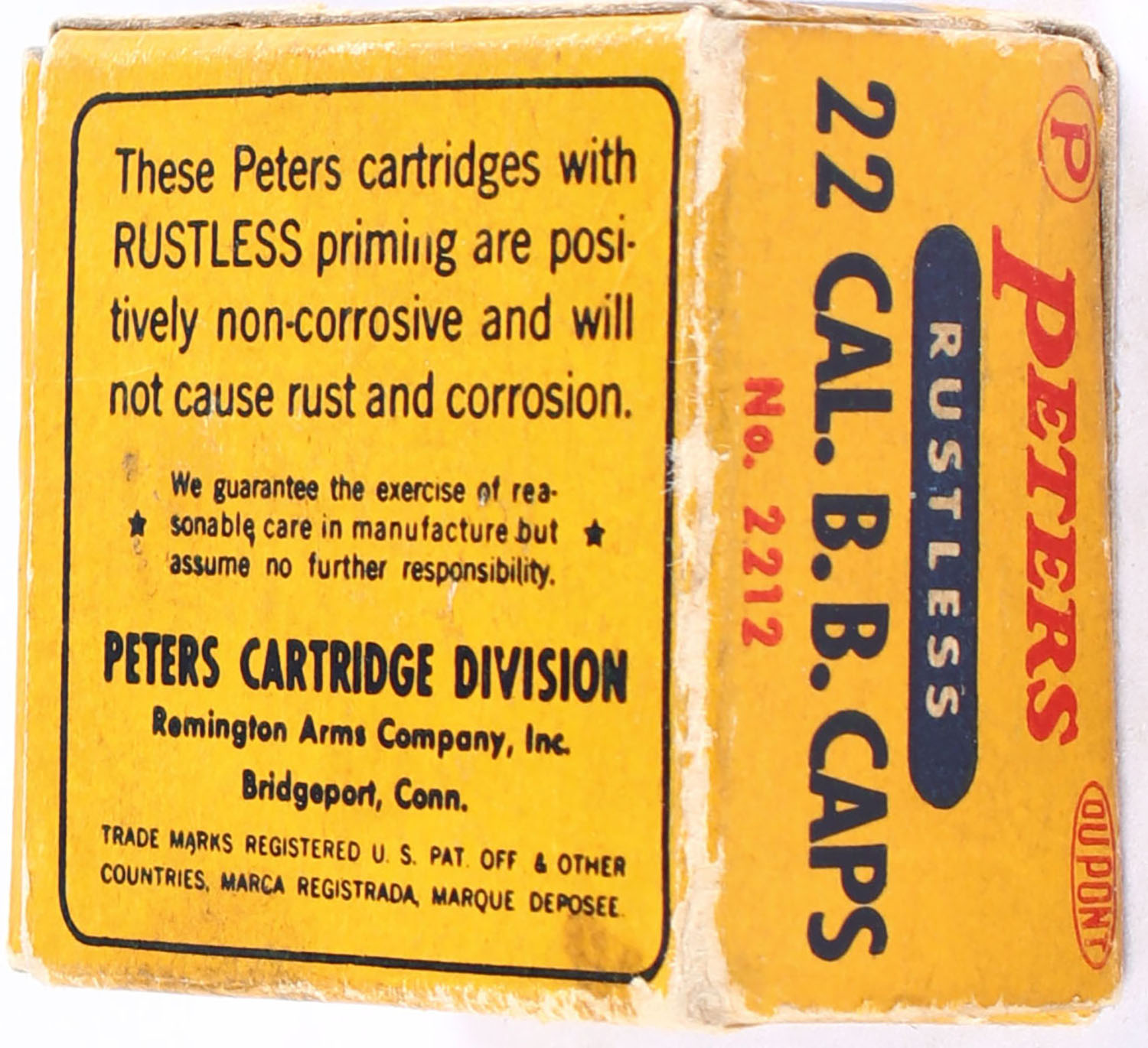 Peters, Rustless, .22 Cal B.B. Caps, RHWeb: PCC-8D BB-1a, Full, 1pc. Blue yellow & red box, box is solid with very good color, some age soiling, crease on front side, some edge & corner wear, end flaps are solid, ammo is excellent. Grade: Very Good + - Value: 50 to 75