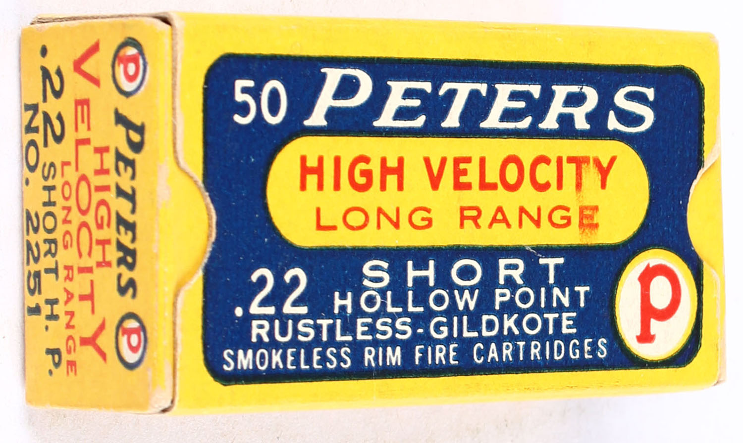 Peters, High Velocity Long Range, .22 Short Hollow Point, Rustless-Gildkote, RHWeb: PCC-11A S-2a, Full, 1pc. Yellow blue & red box, box is near mint with minty color, only very minor corner wear, edges are crisp, end flaps are solid, ammo is excellent to minty. Grade: Excellent ++ - Value: 120 to 180