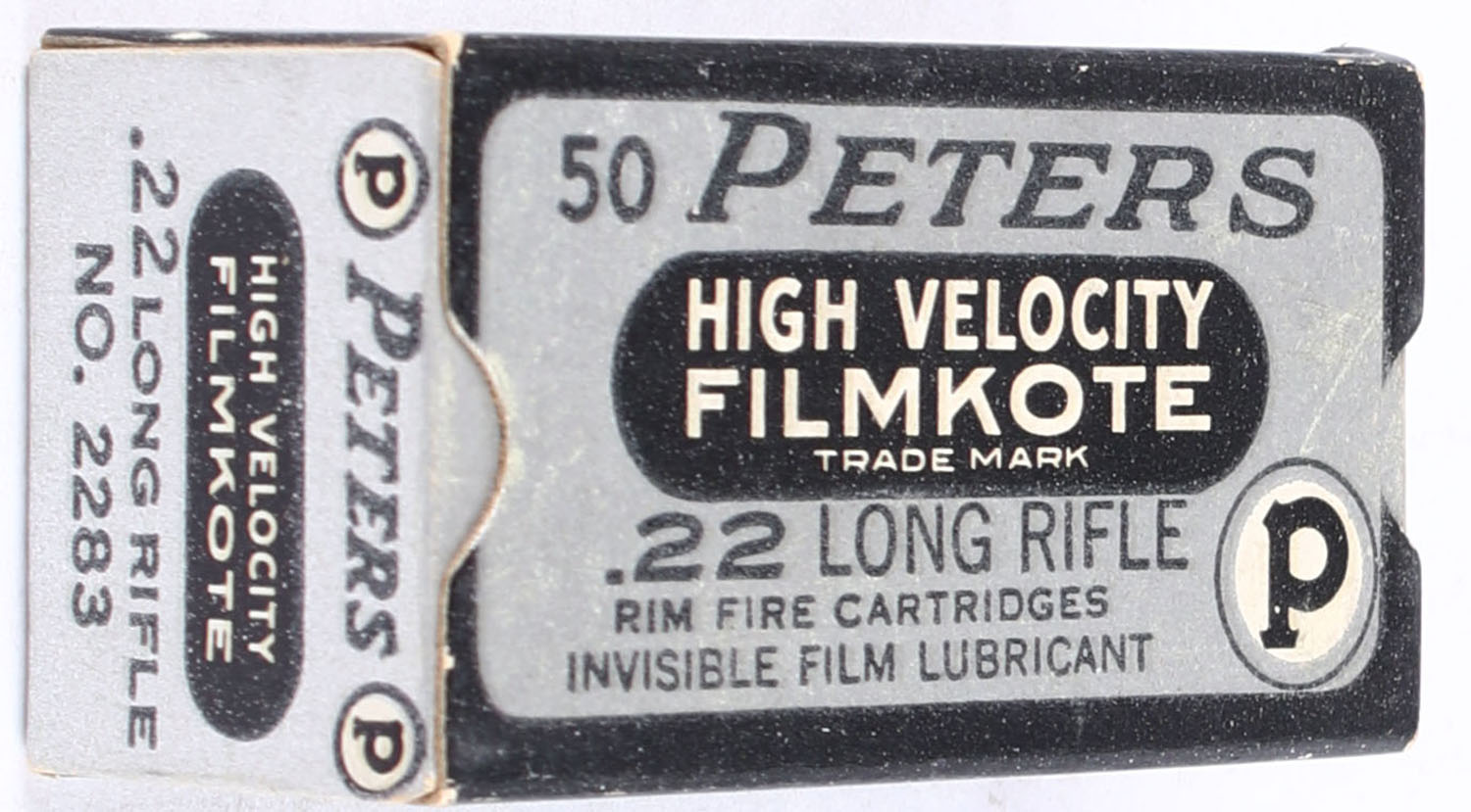 Peters, High Velocity Filmkote, .22 Long Rifle, RHWeb: PCC-13 LR-1a, Full, 1pc. Silver & black box, box is solid with excellent color, very minor corner wear, edges are mostly crisp, end flaps are solid, ammo is excellent. Grade: Excellent + - Value: 20 to 30
