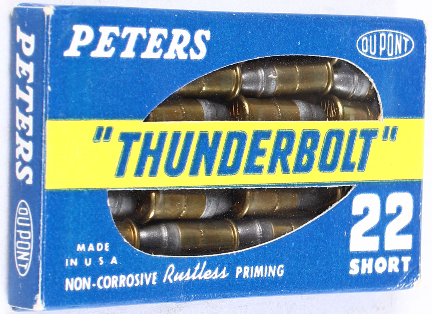 Peters, ''Thunderbolt'', .22 Short, RHWeb: PCC-17 S-5, Full, 1pc. Blue yellow & white flat pack, pack is solid with minty color, minor edge & corner wear, end flaps are solid, ammo appears minty. Grade: Excellent + - Value: 50 to 75