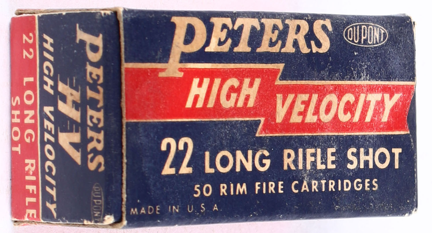 Peters, High Velocity, .22 Long Rifle Shot, RHWeb: PCC-17 LR-4c, Full, 1pc. Blue red & white box, box is solid with very good color, some age soiling & shelf wear, factory seam has unadhered, minor corner wear, very minor edge wear, end flaps are solid, ammo is excellent. Grade: Very Good - Value: 12 to 18