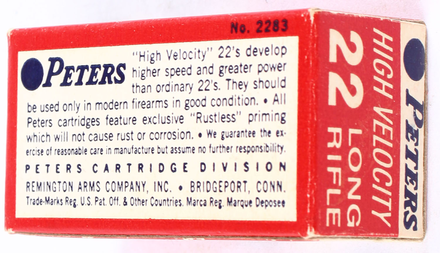 Peters, New High Velocity, .22 Long Rifle, RHWeb: PCC-18 LR-1, Full, 1pc. Red white & blue box, box is solid with excellent color, very minor age soiling & corner wear, end flaps are solid, ammo is excellent. Grade: Excellent - Value: 12 to 18