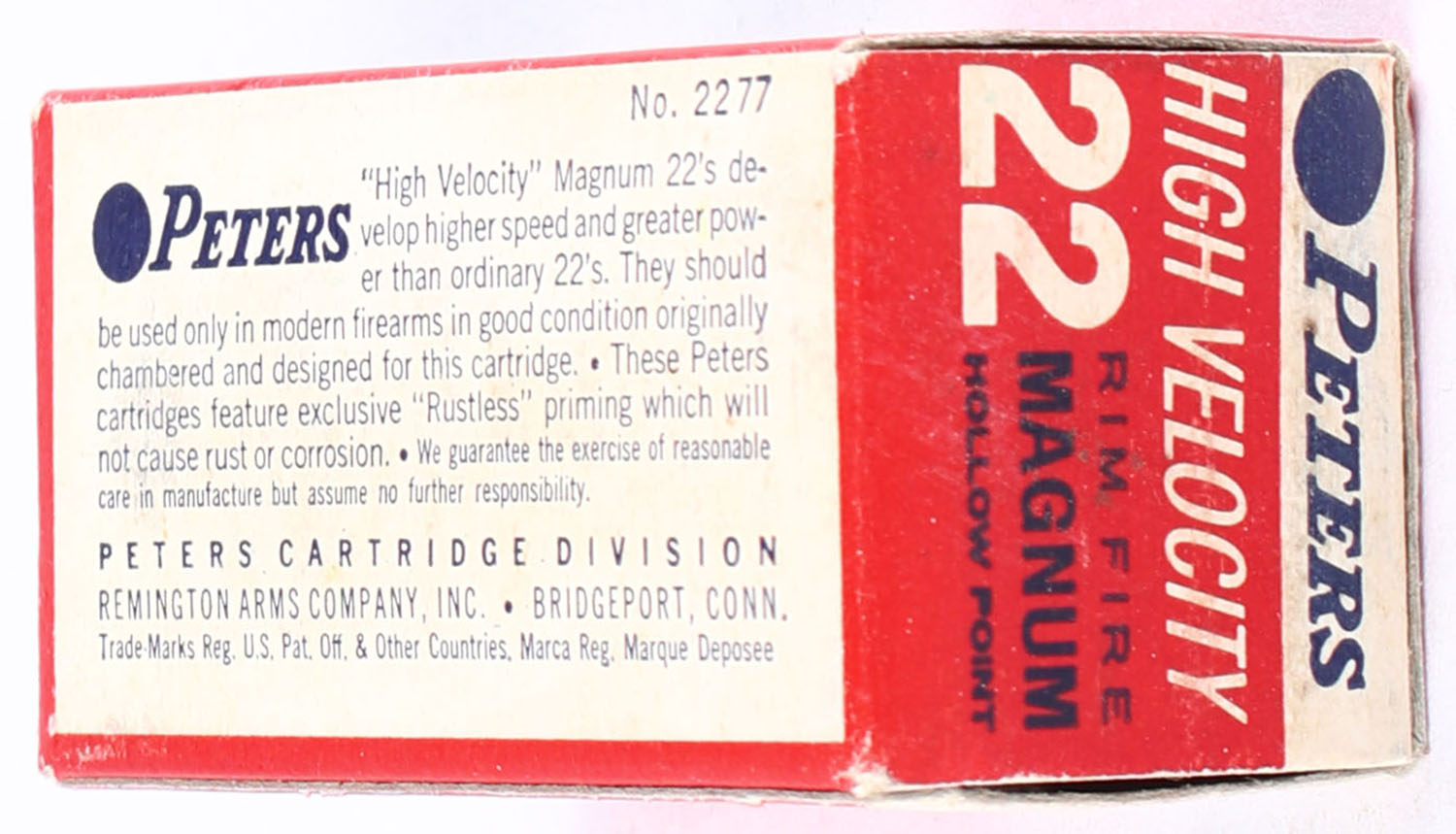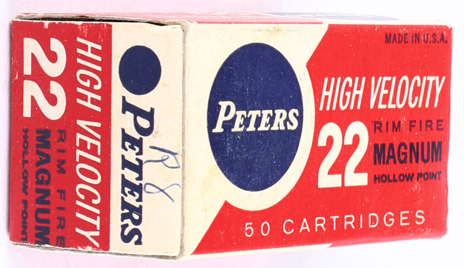 Peters, High Velocity, .22 Magnum Rim Fire Hollow Point, RHWeb: PCC-18 WMR-1, Full, 1pc. Red white & blue box, box is solid with very good to excellent color, minor age soiling right end flap has been written on, very minor corner wear, edges are crisp, end flaps are solid, ammo is excellent. Grade: Very Good ++ - Value: 24 to 36
