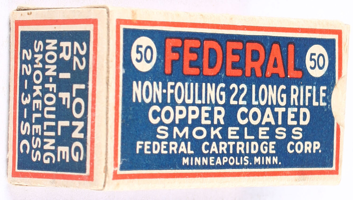 Federal, Non-Fouling Copper Coated, .22 Long Rifle, Smokeless, RHWeb: FCC-3 LR-2b (''C'' Bottom), Full, 1pc. Blue red & buff box, box is solid with excellent color, very minor age soiling & edge wear, minor corner wear, end flaps are solid, ammo is excellent. Grade: Excellent - Value: 100 to 150