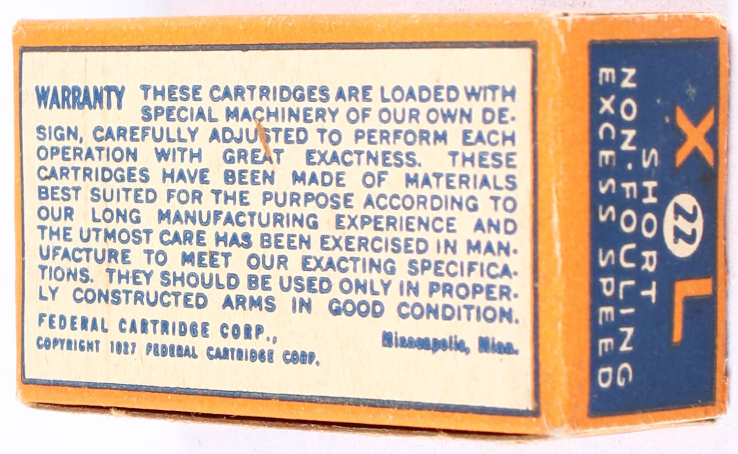 Federal, XL Cartridges, .22 Short, RHWeb: FCC-4.1 S-2d, Full, 1pc. Blue orange & white box, box is solid with excellent color, very minor age soiling & corner wear, edges are crisp, end flaps are solid, ammo is excellent. Grade: Excellent + - Value: 160 to 240
