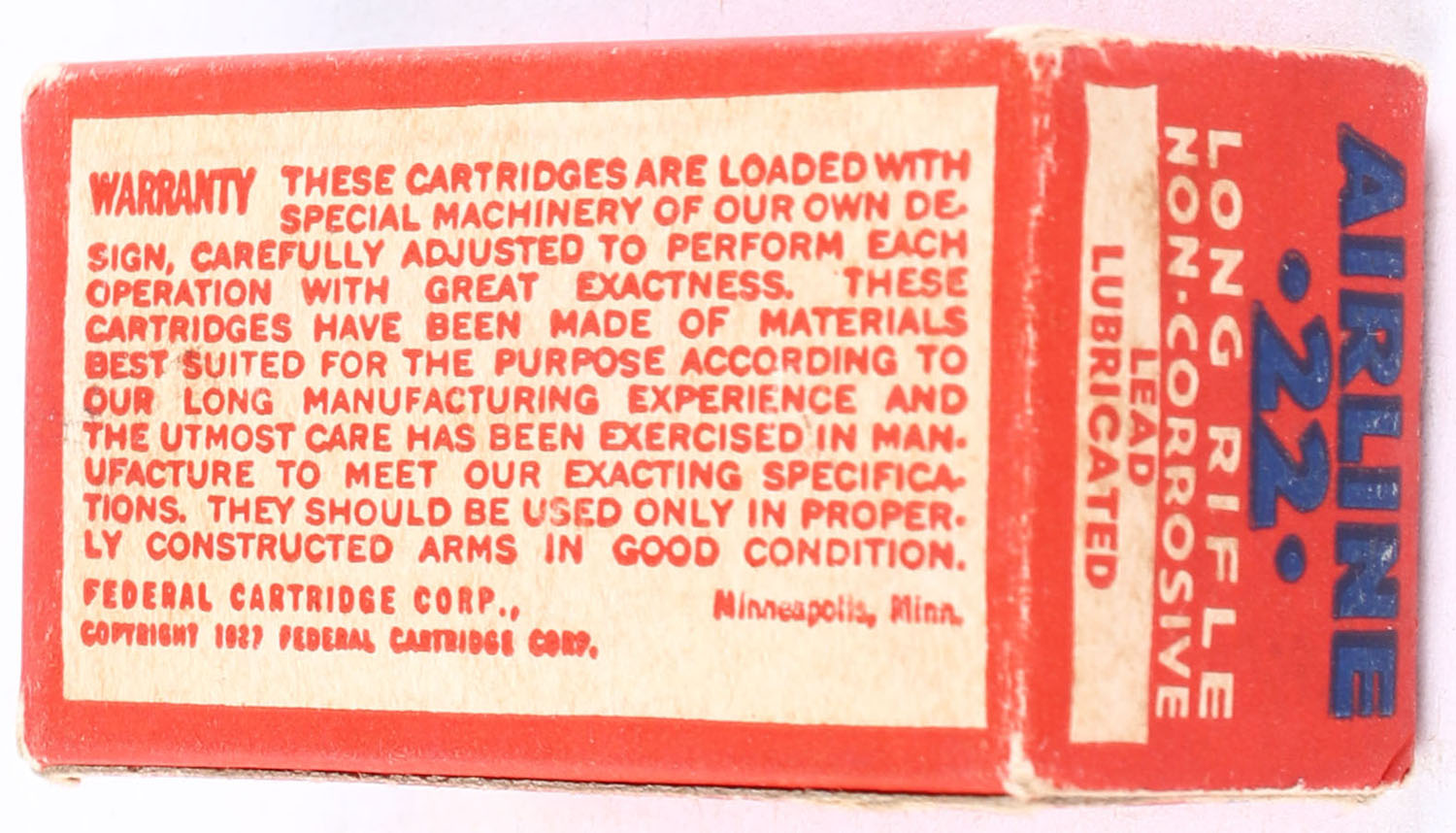 Federal, Airline Cartridges, .22 Long Rifle, Lead Lubricated, RHWeb: FCC-4.3 LR-1b, Full, 1pc. Red white & blue box, box is solid with very good to excellent color, minora age soiling, some corner wear, edges are mostly crisp, end flaps are solid, ammo is excellent. Grade: Excellent - Value: 40 to 60