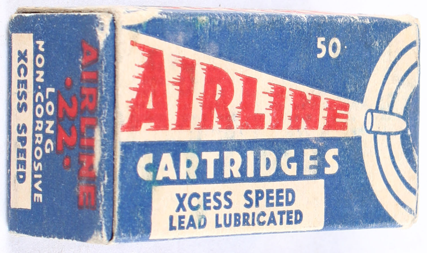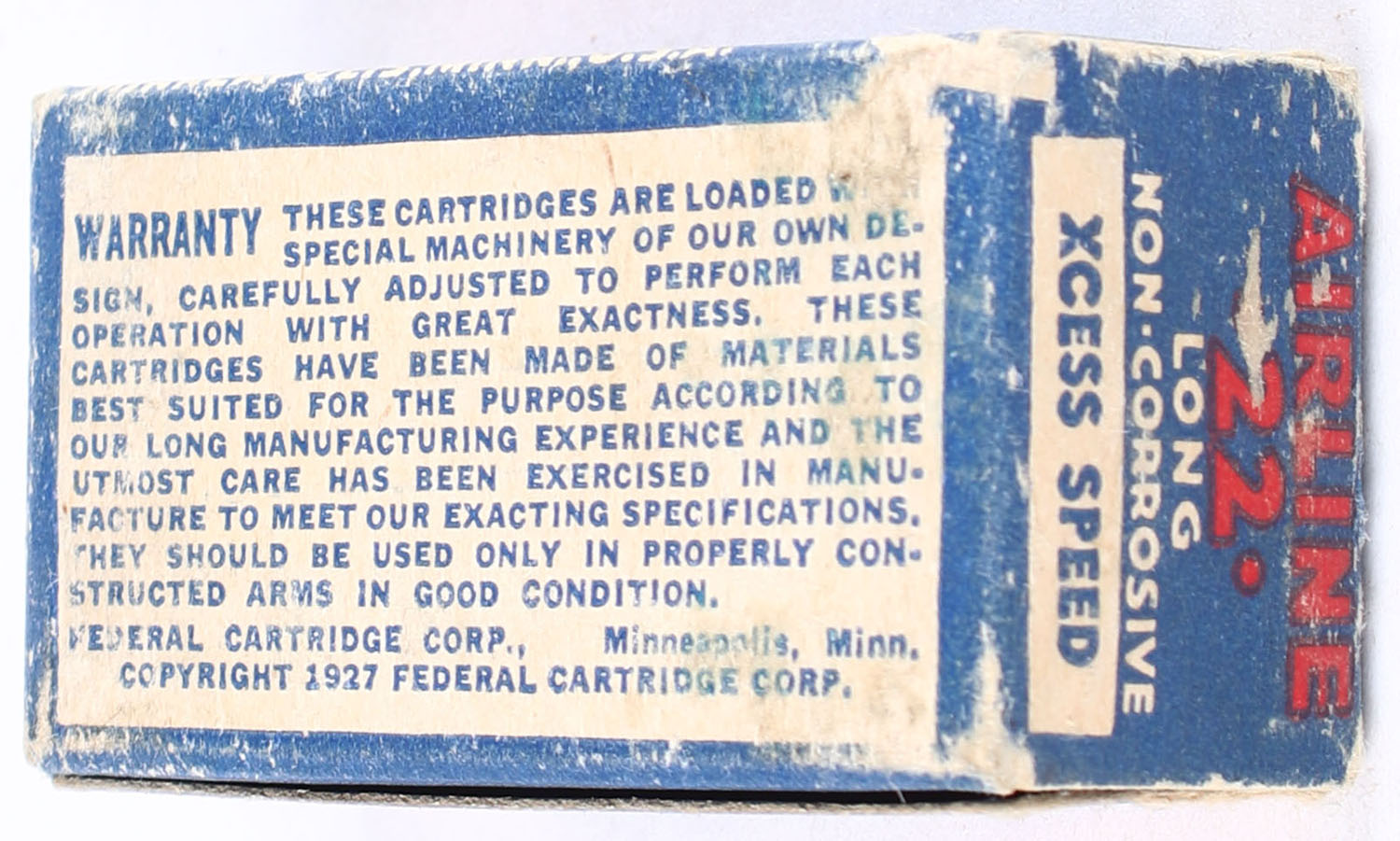 Federal, Airline Cartridges, .22 Long, Xcess Speed Lead Lubricated, RHWeb: FCC-4.3 L-6a, Partial 49rds., 1pc. Blue white & red box, box is solid with very good color, minor age soiling, some shelf wear, minor corner wear, very minor edge wear, end flaps are solid, ammo is very good. Grade: Very Good + - Value: 40 to 60