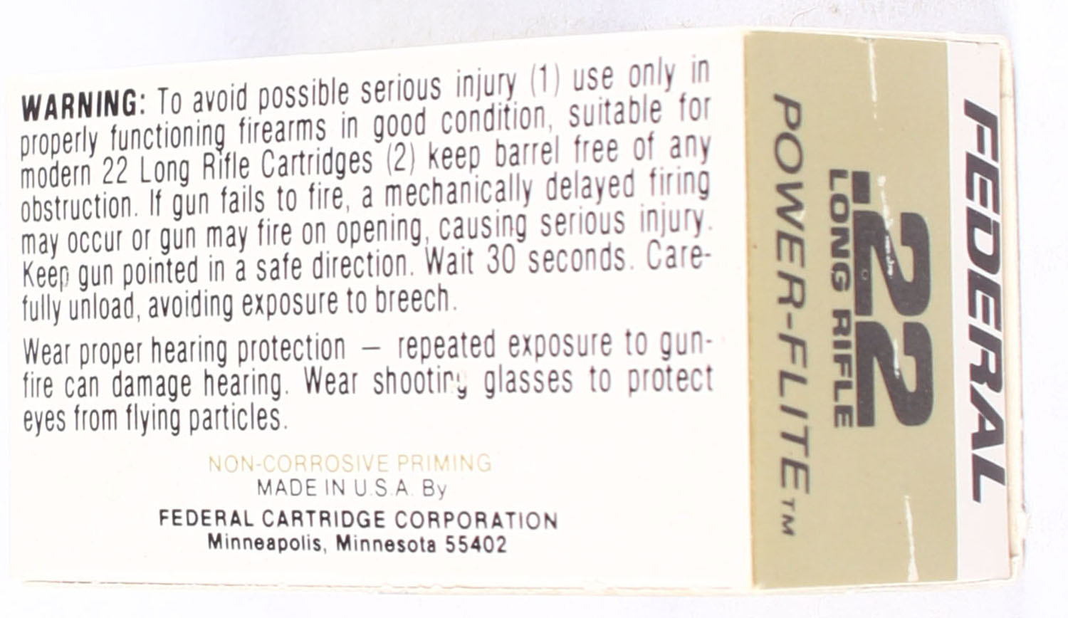 Federal, Power-Flite, .22 Long Rifle, RHWeb: FED-12 LR-3 Full, 1pc. Gold white & black box, box is near mint with minty color, only very minor shelf wear, corners are sharp, edges are crisp, end flaps are solid, ammo is minty. Grade: Excellent ++ - Value: 10 to 15