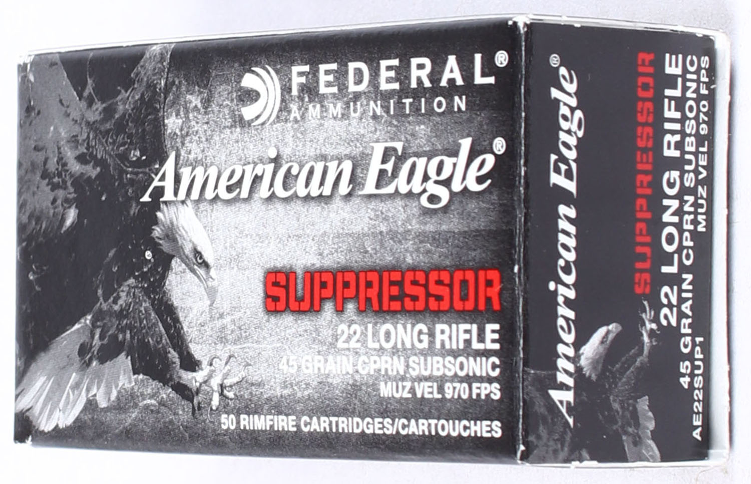 Federal, American Eagle Suppressor, .22 Long Rifle, 45 Grain Copper Plated Round Nose, Subsonic, 970 FPS, Not in RHWeb, Full, 1pc. Black white & red box, box is MINT with minty color, corners are sharp, edges are crisp, end flaps are solid, ammo is minty. Grade: MINT - Value: 10 to 15