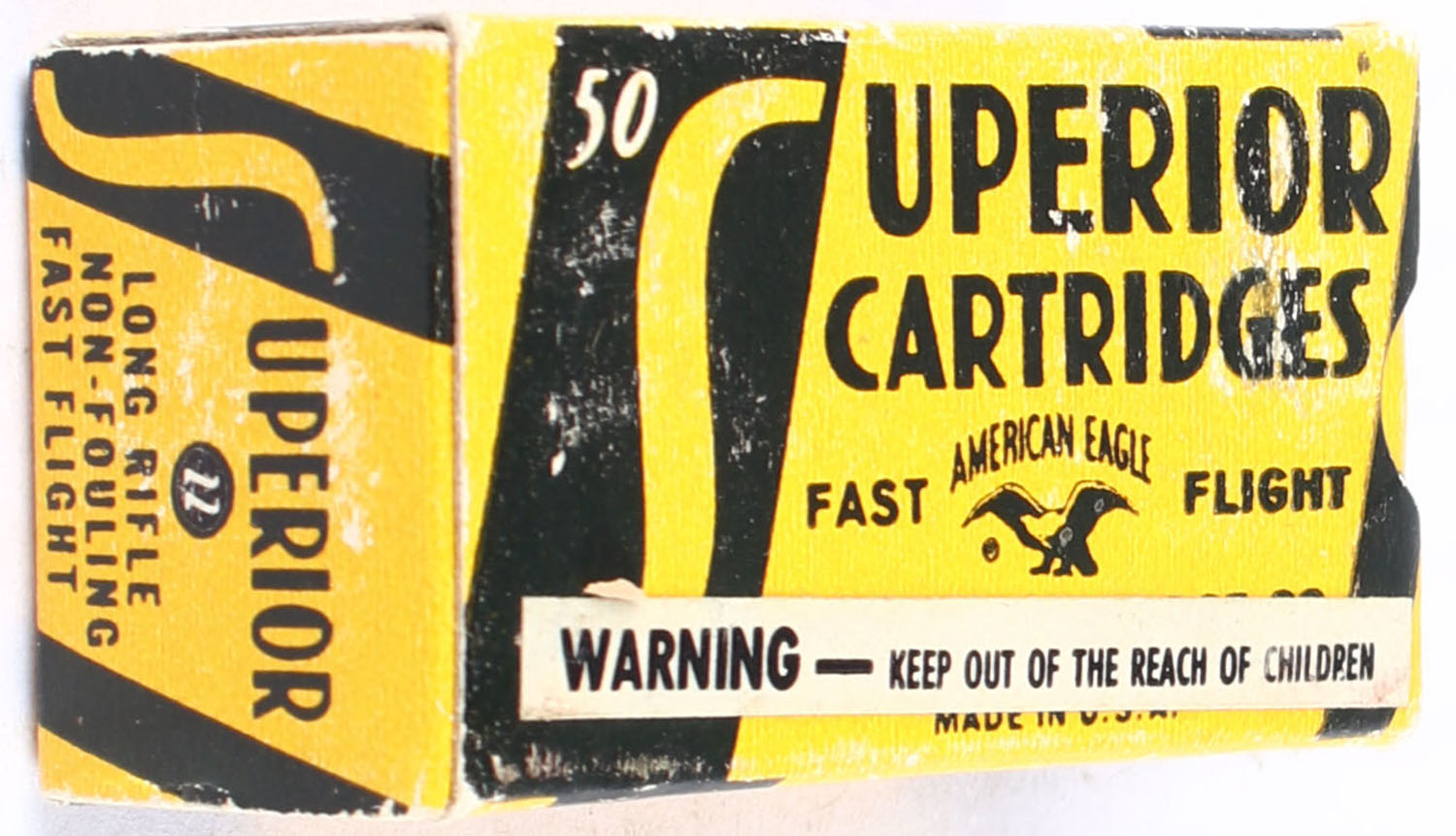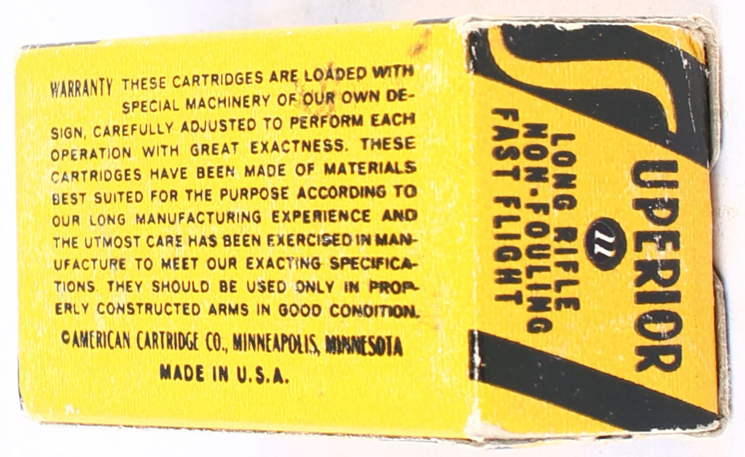 American, Superior Cartridges, .22 Long Rifle, RHWeb: ACC-4, LR-1a, Full, 1pc. Yellow & black box with white child warning over-label, box is solid with excellent color, minor shelf & corner wear, edges are mostly crisp, end flaps are solid, ammo is excellent. Grade: Very Good ++ - Value: 16 to 24