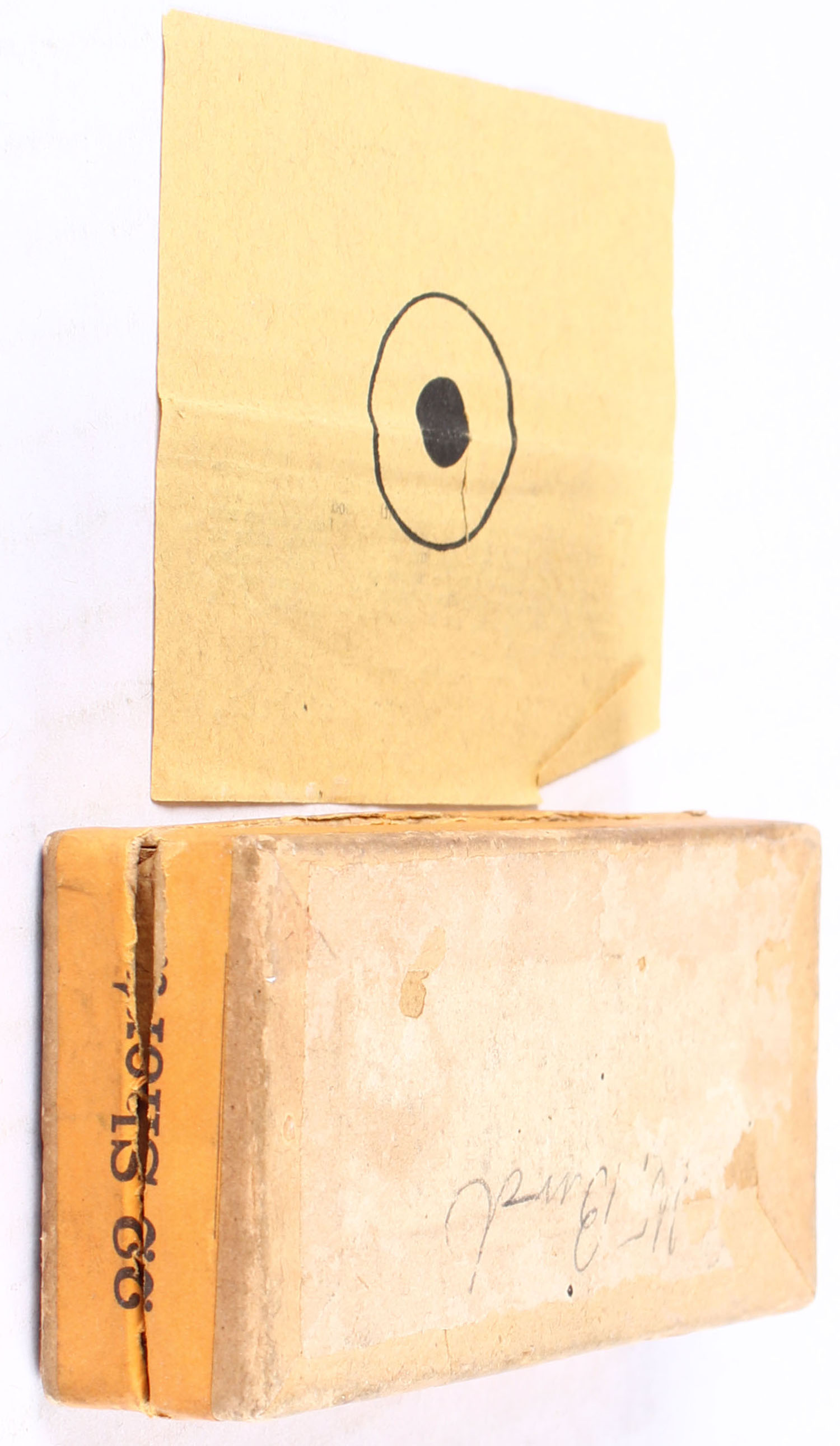 U.S., Metallic Cartridges, .22 Short, Target Cartridges, RHWeb: US-2 S-1b, Partial 40rds., 2pc. Buff box with gray top & orange side sealing labels, CONTAINS 100 ROUND BOX TARGET INSERT, box is solid with very good color, some age soiling, minor corner wear, some edge wear, labels are intact, insert is good, has small tear in center, ammo is very good. Grade: Very Good + - Value: 150 to 225