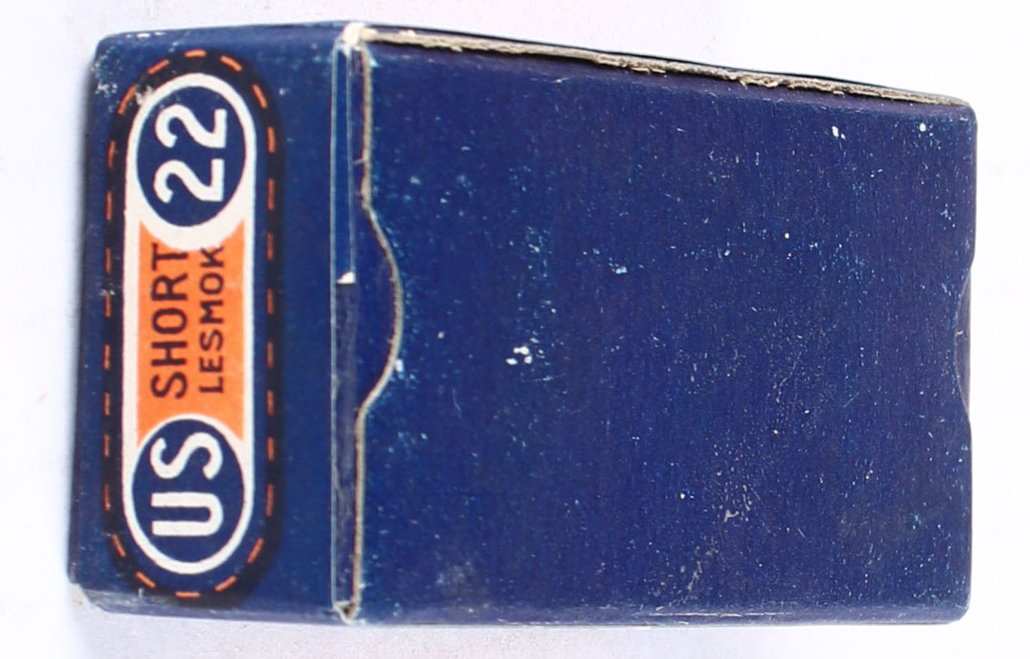 U.S., Rim Fire, .22 Short, Lesmok, RHWeb: US-8 S-2b, FULL & SEALED, 1pc. Blue orange & white box with blue & orange side sealing label, box is solid with excellent color, very minor corner wear, edges are crisp, label is intact. Grade: Excellent + - Value: 30 to 45
