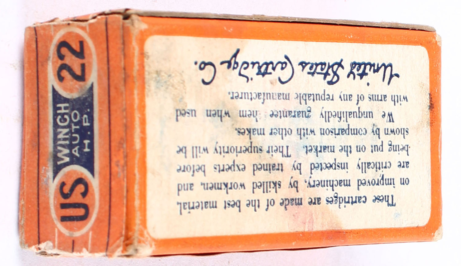 U.S., Smokeless Rim Fire, .22 Winchester Auto. Hollow Point, RHWeb: US-8 WA-2, Partial 3rds., 1pc. Orange blue & white box, box is solid with very good color, some staining on top, minor edge & corner wear, end flaps are solid, ammo is excellent. Grade: Very Good + - Value: 10 to 15