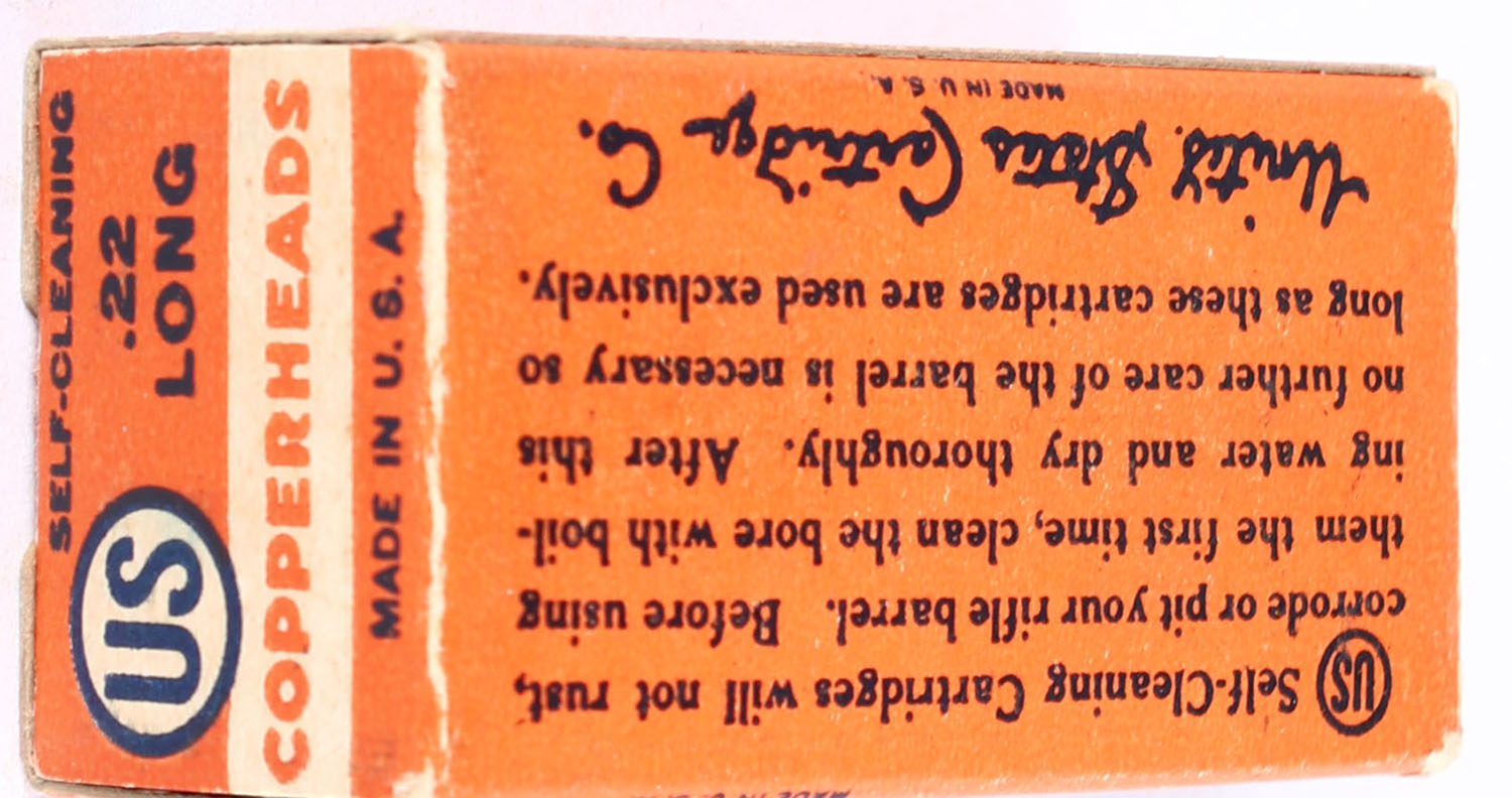 U.S., Copperheads, .22 Long, Self-Cleaning, RHWeb: US-12 L-1b, Full, 1pc. Orange white & blue box, box is solid with excellent color, very minor age soiling & corner wear, edges are crisp, end flaps are solid, ammo is excellent. Grade: Excellent + - Value: 220 to 330
