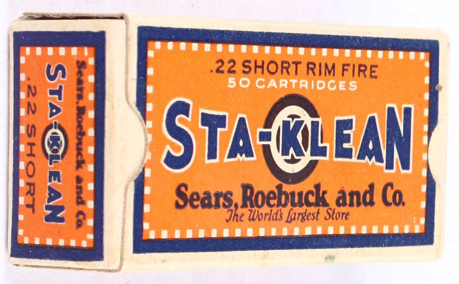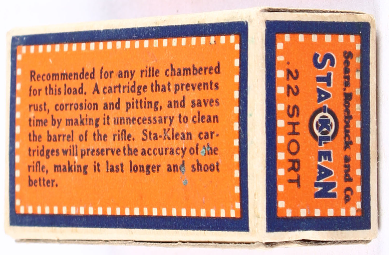 Sears, Sta-Klean, .22 Short, RHWeb: SEARS-2 S-1, Full, 1pc. Orange blue & buff box, box is solid with excellent color, very minor corner wear, edges are crisp, end flaps are solid, ammo is excellent. Grade: Excellent ++ - Value: 50 to 75