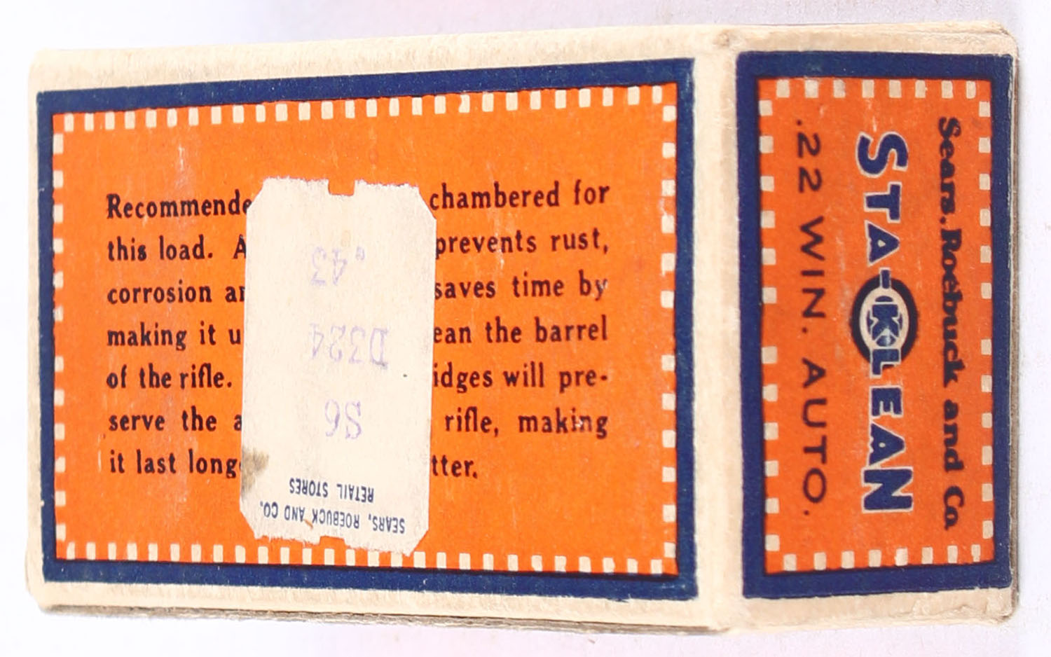 Sears, Sta-Clean, .22 Winchester Auto, RHWeb: SEARS-2 WA-1, Full, 1pc. Orange blue & buff box, box is solid with excellent color, minor corner wear, edges are mostly crisp, end flaps are solid, ammo is excellent. Grade: Excellent + - Value: 50 to 75