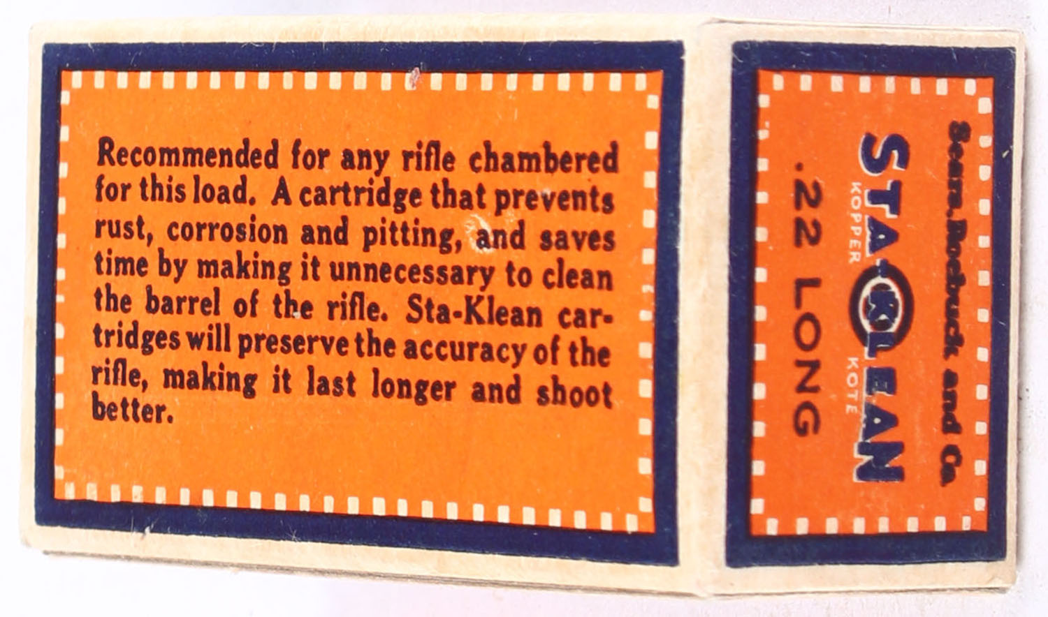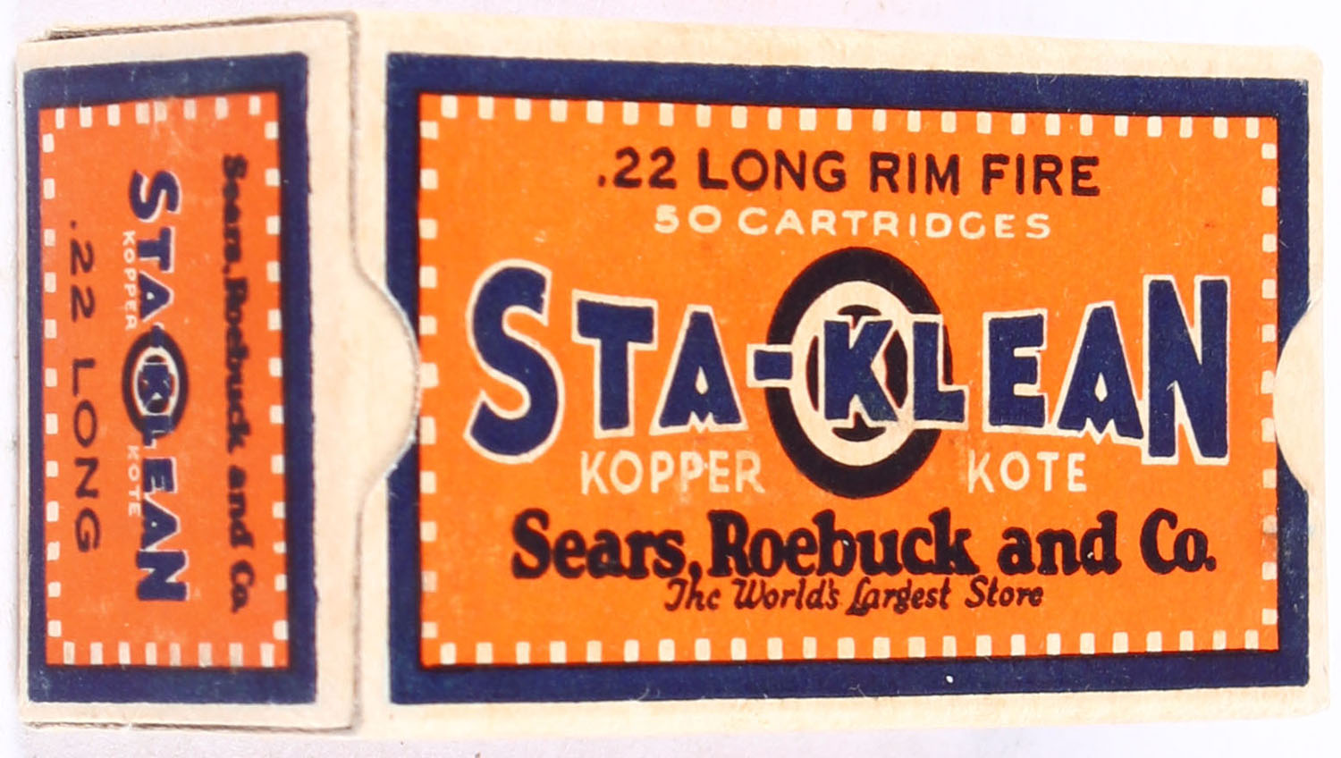 Sears, Sta-Klean Kopper Kote, .22 Long, RHWeb: SEARS-3 L-1a, Full, 1pc. Orange blue & buff box, box is solid with excellent color, very minor age soiling, corners are mostly sharp, edges are crisp, end flaps are solid, ammo is excellent. Grade: Excellent ++ - Value: 70 to 100